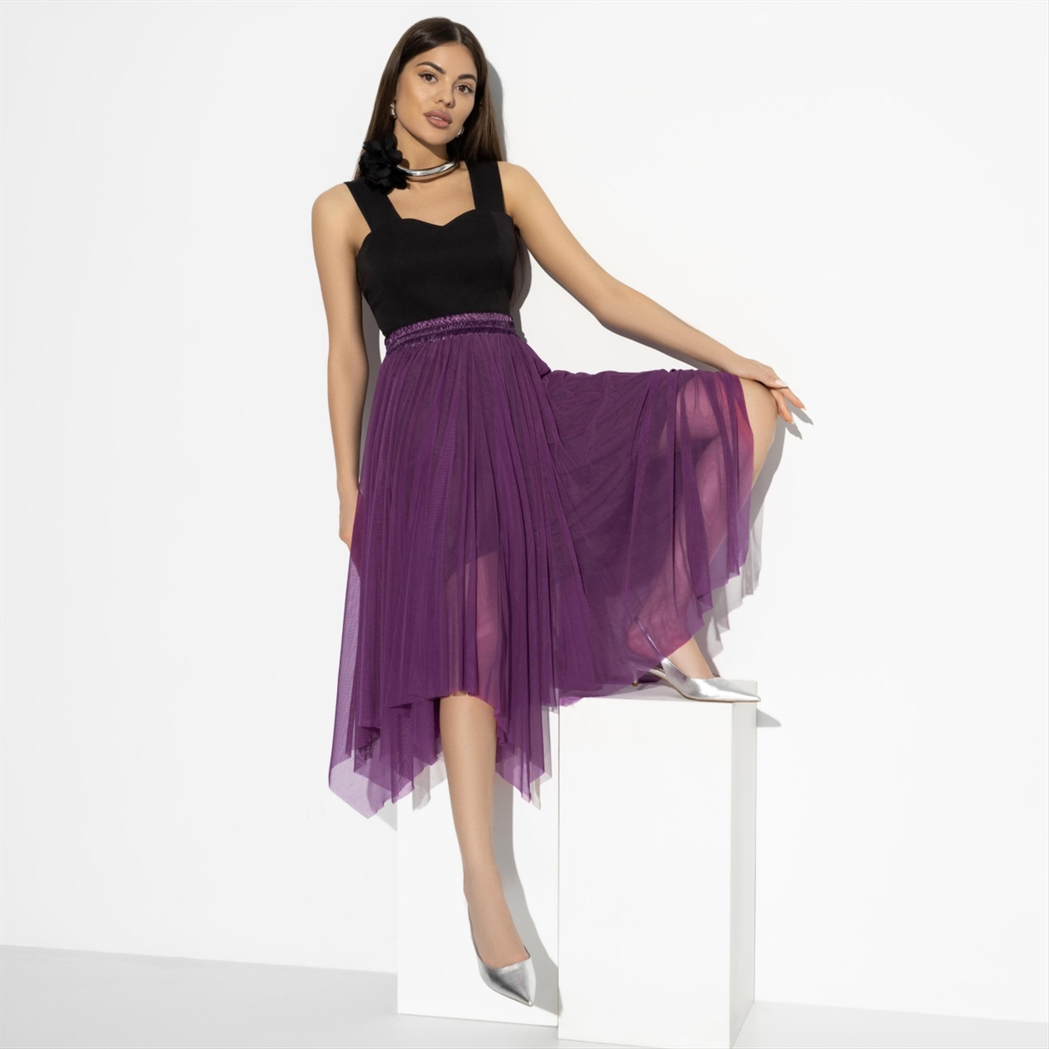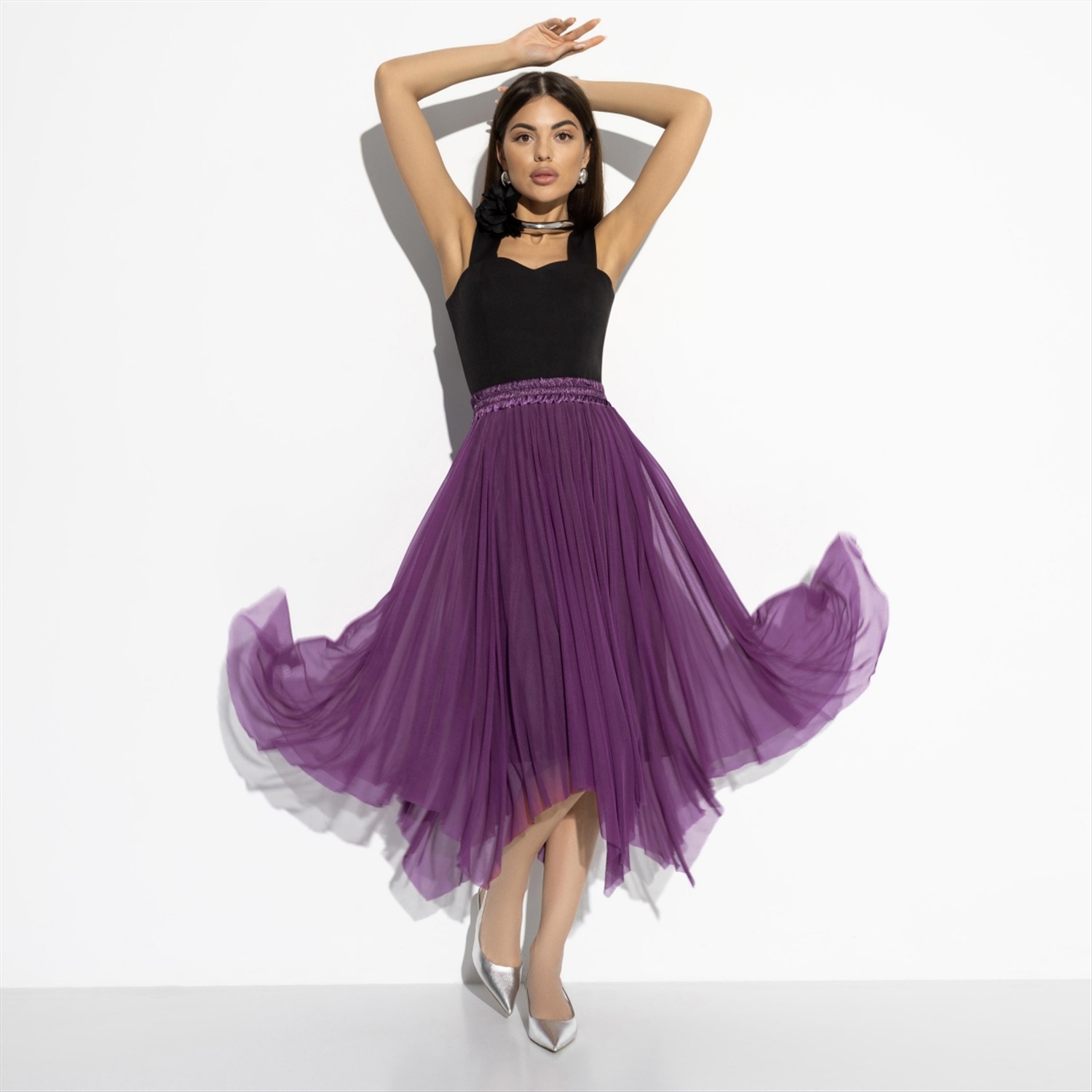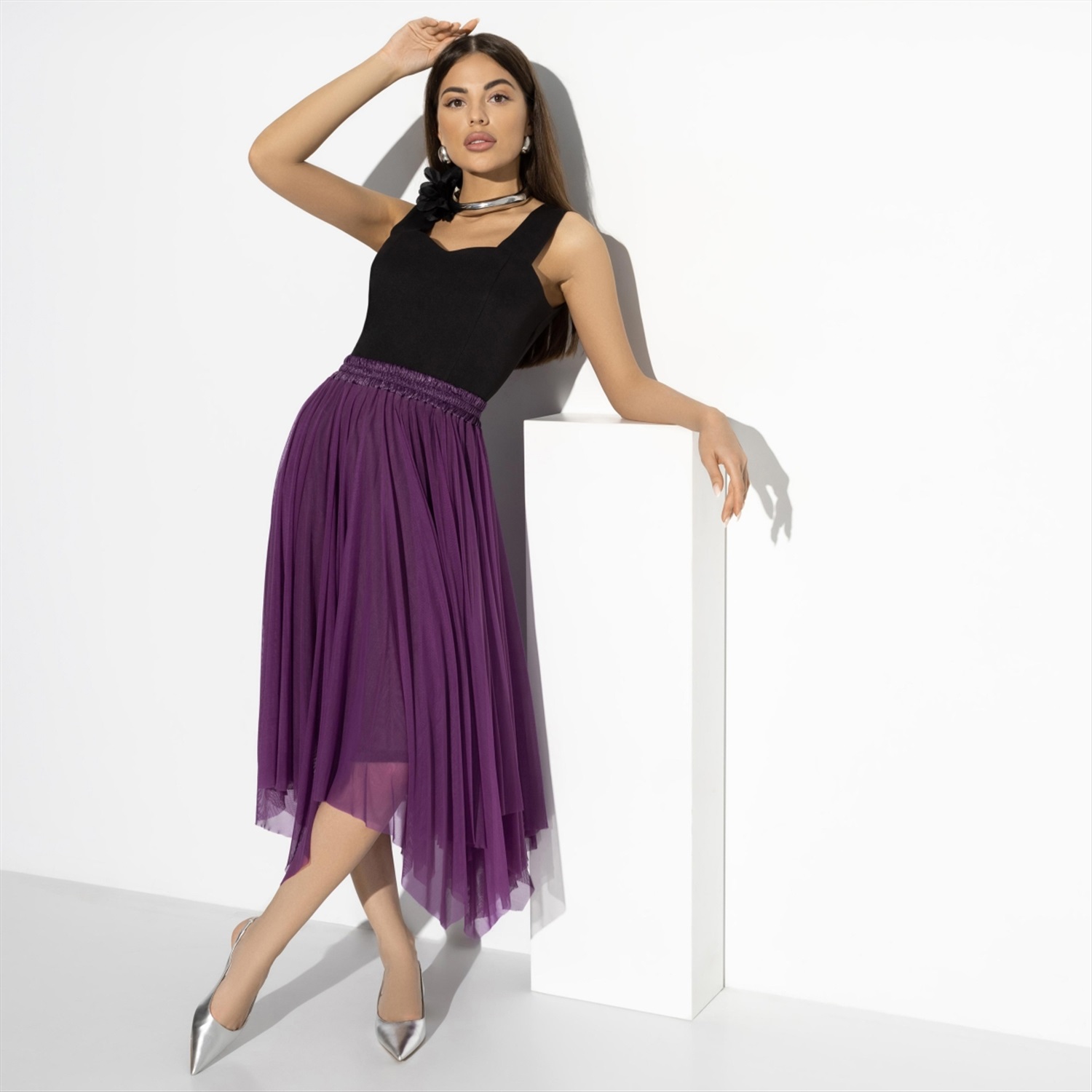 ТН ВЭД: 6104530000; Состав: «Сетка стрейч», трикотаж «вискоза», «сатин креш» (65% п/э, 30% вискоза, 5% спандекс); Плотность ткани: Тонкая; Тип ткани: Трикотаж; Вид застежки: Нет; Декоративные элементы: Драпировка; Карманы: Нет; Основной цвет ткани: Фиолетовый; Отрезная талия: Есть; Подклад: Есть; Резинка по талии: Есть; Рисунок/раппорт: Нет, все изделия идентичны; Сезон: Круглогодичный; Силуэт: Свободный; Стиль: Вечерний; Фасон юбки: Пачка