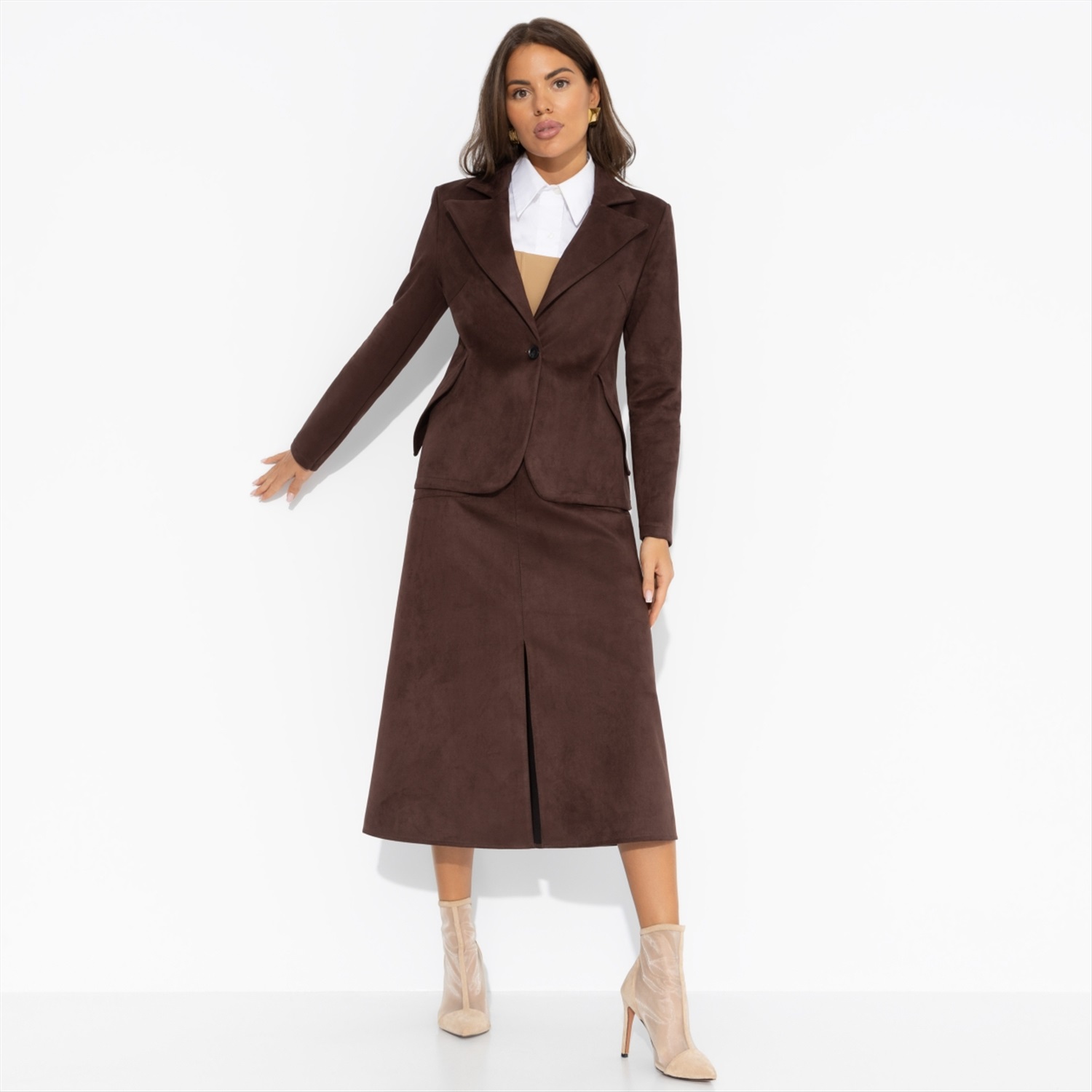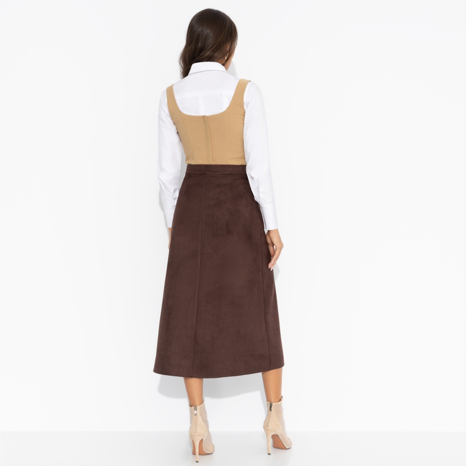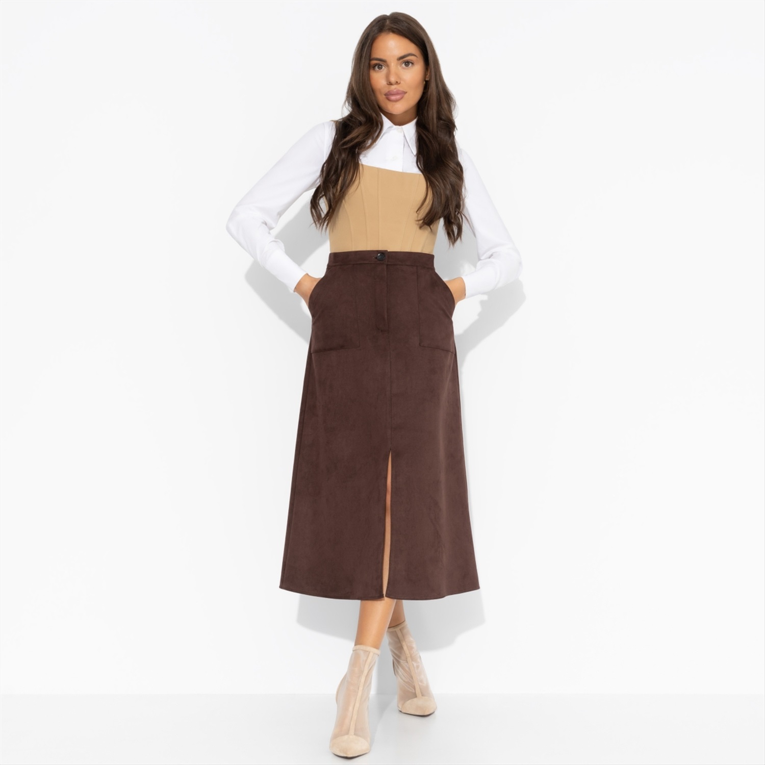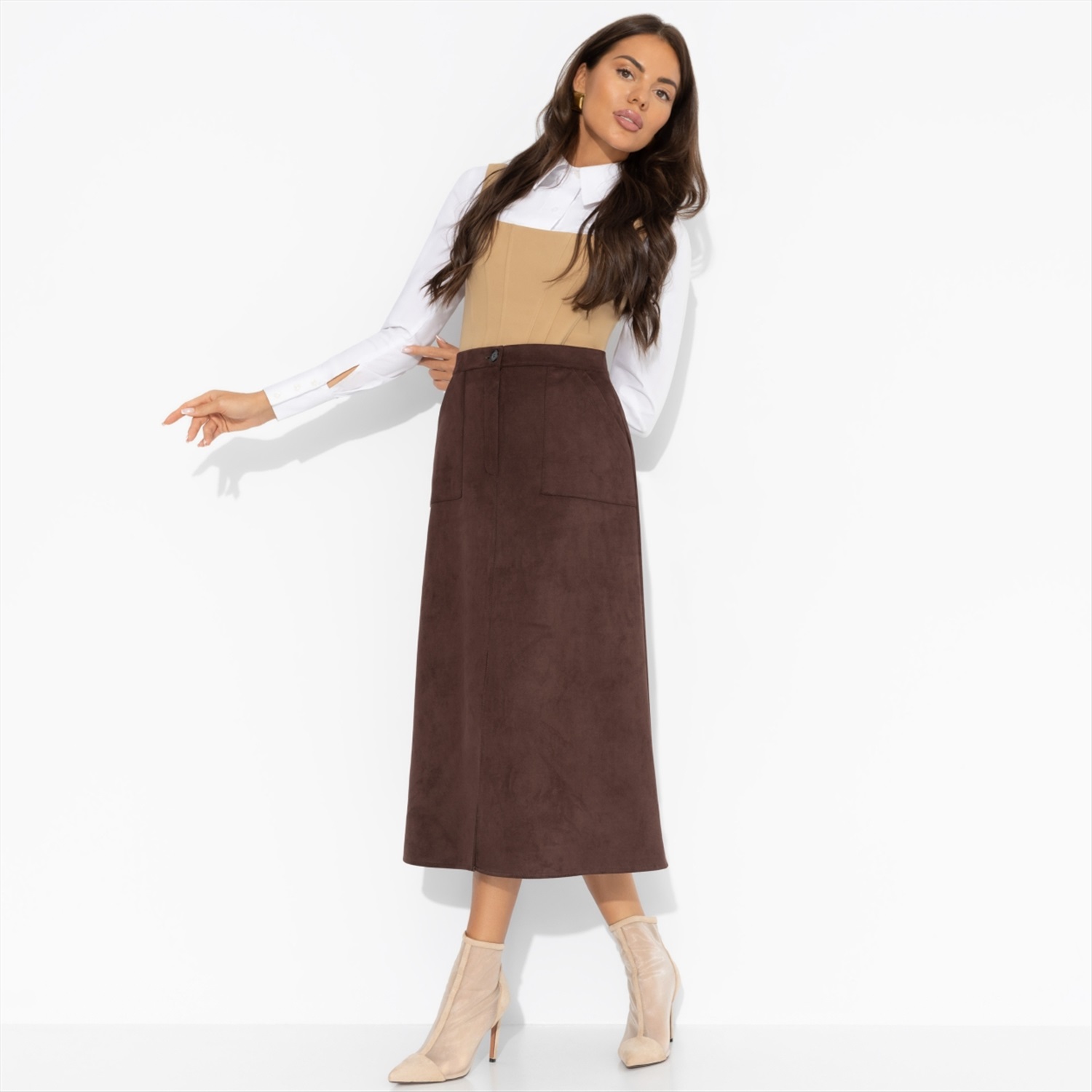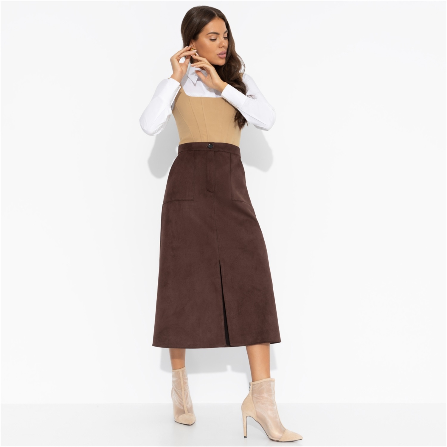Юбка ЧАРУТТИ цвета спелого каштана – буквально суть осенней элегантности. Плотная замша создана для осени, как резиновые сапоги для луж. Безупречный мэтч! Дополняйте образ блузами, свитерами или жакетом из той же ткани, и чувствуйте себя роскошно, даже если погода не шепчет. Юбка трапециевидного силуэта в длине миди. Посадка высокая. Юбка застегивается на пуговицу и молнию. Есть карманы. Деликатный разрез по центрально части изделия.
