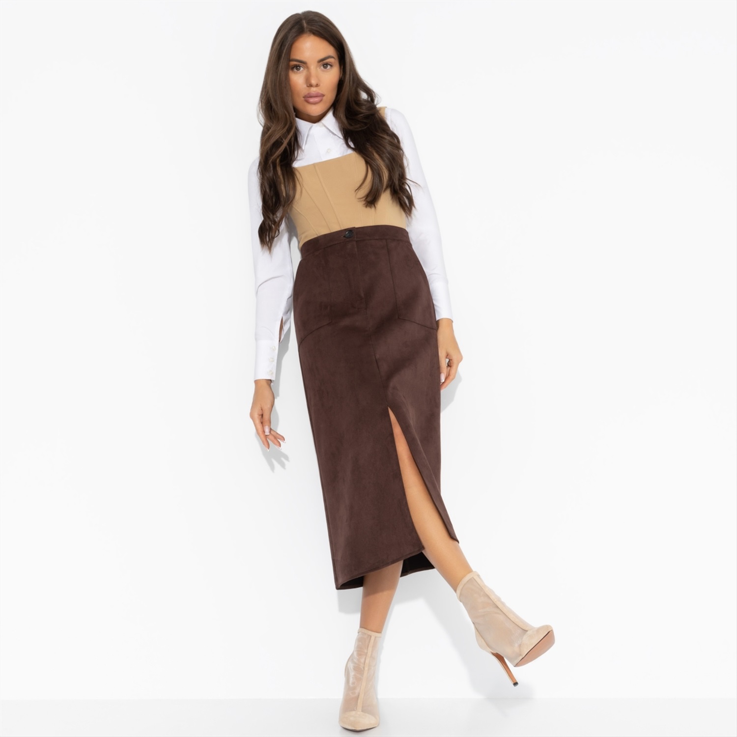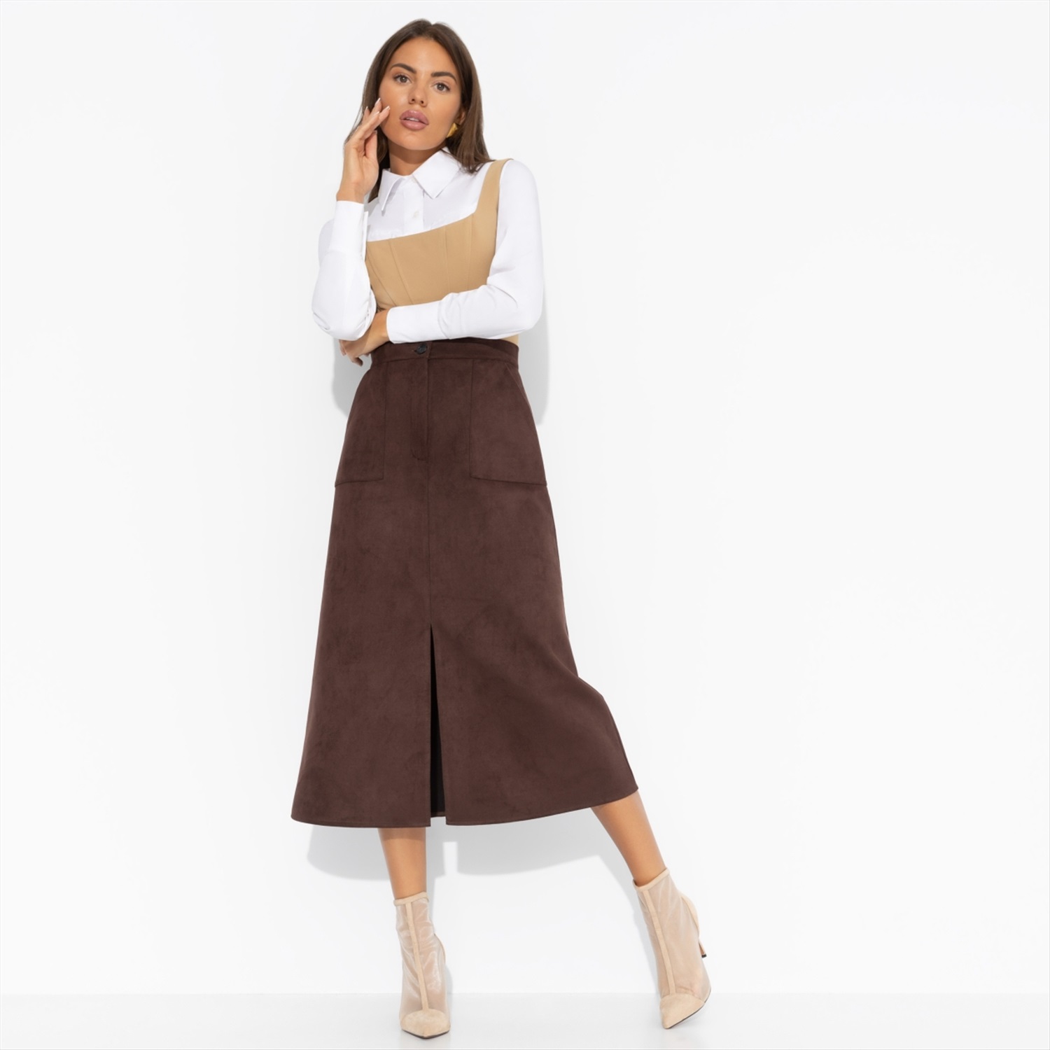 ТН ВЭД: 6204530000; Состав: Замша на скубе (95% п/э, 5% спандекс); Плотность ткани: Средняя; Тип ткани: Текстиль; Вид застежки: Пуговица/-ы, молния; Высота посадки: Средняя; Карманы: Накладные; Основной цвет ткани: Коричневый; Отрезная талия: Есть; Подклад: Нет; Резинка по талии: Нет; Рисунок/раппорт: Нет, все изделия идентичны; Сезон: Круглогодичный; Стиль: Повседневный; Фасон юбки: Прямая