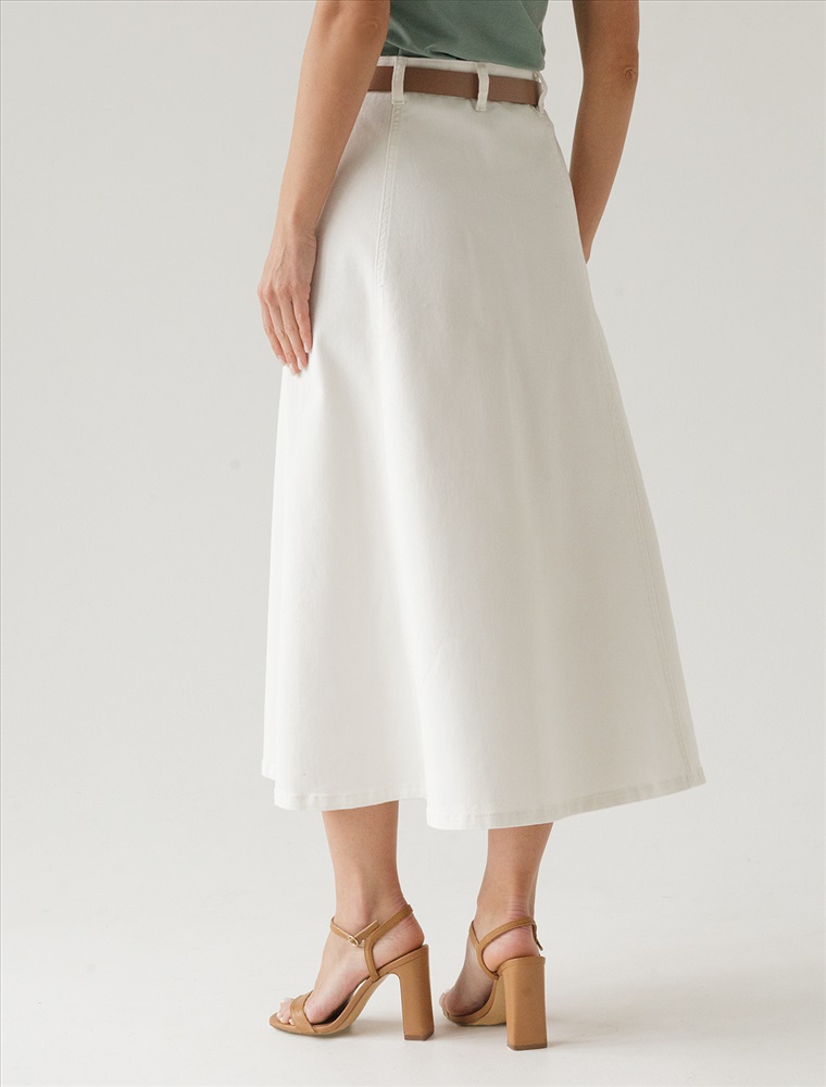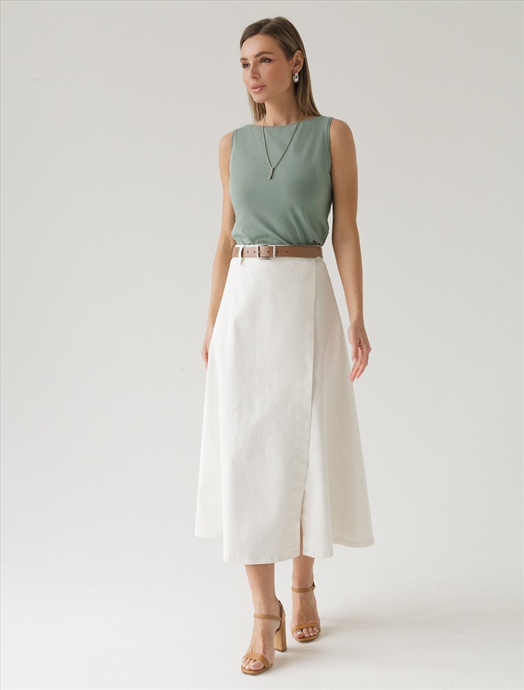 Юбка А-силуэта с застежкой на запАх выполнена из эластичного денима. Модель свободного кроя с посадкой на талии. Застежка на две пуговицы. Мягкий эластичный деним обеспечит комфорт и свободу движений. Хорошо сочетается с любым верхом и разной обувью.
