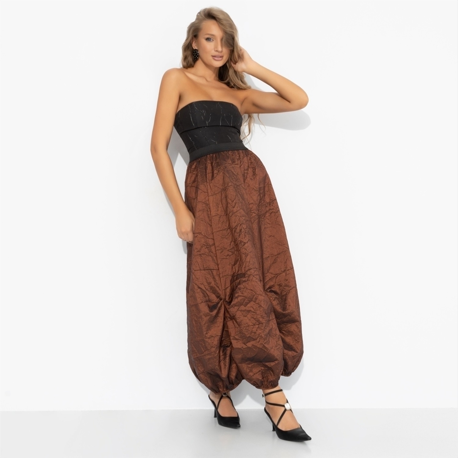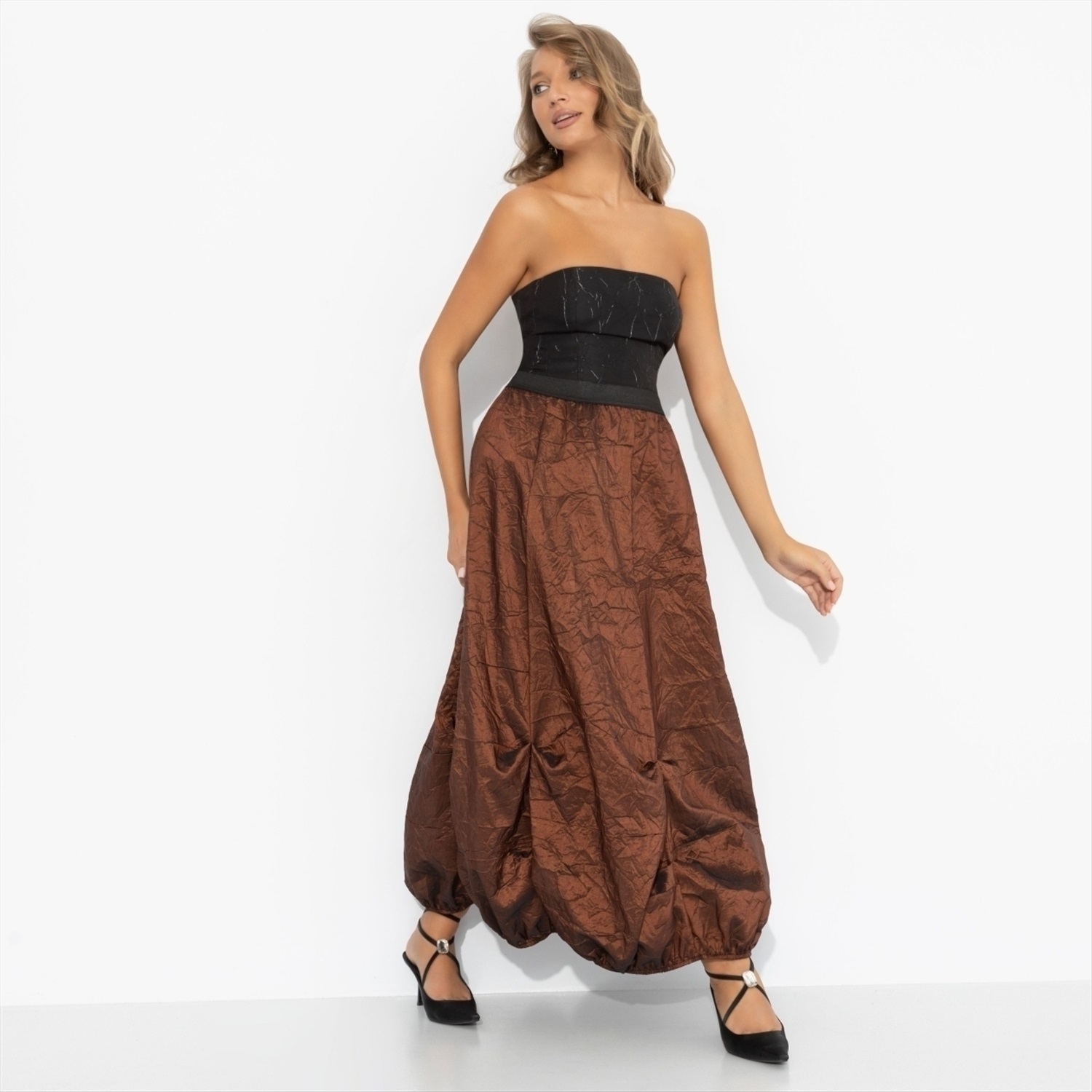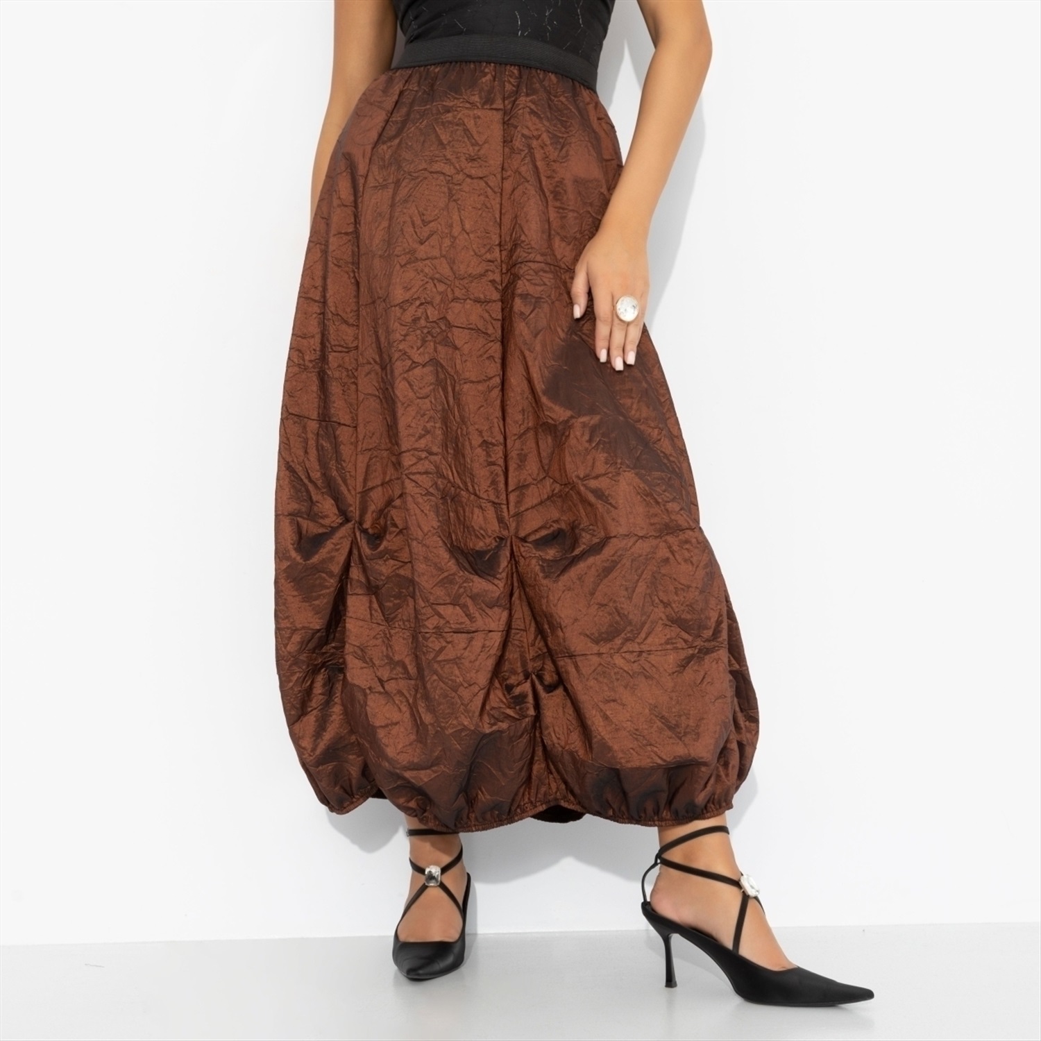 ТН ВЭД: 6204530000; Состав: Плательная ткань «таффета» (100% п/э); Плотность ткани: Средняя; Тип ткани: Текстиль; Вид застежки: Нет; Декоративные элементы: Драпировка; Основной цвет ткани: Коричневый; Отрезная талия: Есть; Подклад: Нет; Резинка по талии: Есть; Рисунок/раппорт: Нет, все изделия идентичны; Сезон: Круглогодичный; Стиль: Вечерний Параметры модели на фото: Грудь: 90 см Талия: 65 см Бёдра: 91 см Рост: 168 см. Размер на модели: 44 Длина изделия: * 42 размер - 95 см * 44 размер - 95 см * 46 размер - 95 см * 48 размер - 95 см * 50 размер - 95 см * 52 размер - 95 см Обхват талии: * 42 размер - 66 см * 44 размер - 70 см * 46 размер - 74 см * 48 размер - 78 см * 50 размер - 82 см * 52 размер - 86 см Обхват бёдер: * 42 размер - 112 см * 44 размер - 116 см * 46 размер - 120 см * 48 размер - 124 см * 50 размер - 128 см * 52 размер - 132 см Вес товара, кг: * 42 размер - 0.25 * 44 размер - 0.26 * 46 размер - 0.26 * 48 размер - 0.28 * 50 размер - 0.28 * 52 размер - 0.28 Габариты товара (ДхШхВ), см.: * 42 размер - 32 х 32 х 2 * 44 размер - 32 х 32 х 2 * 46 размер - 32 х 32 х 2 * 48 размер - 32 х 32 х 2 * 50 размер - 32 х 32 х 2 * 52 размер - 32 х 32 х 2 Юбка-баллон в оттенке эффектной бронзы, как на показах Celine. Хочешь удивить всех на корпоративной ёлке? Надевай с корсетом для wow-выхода по примеру Зендеи или с укороченным блейзером – в духе модных хроник Met Gala. Объемная юбка из жатой ткани с отливом и защипами. Пояс на резинке. Держит форму, не мнётся. Идеальна для трендовых сетов и акцентных образов любой вечеринки.