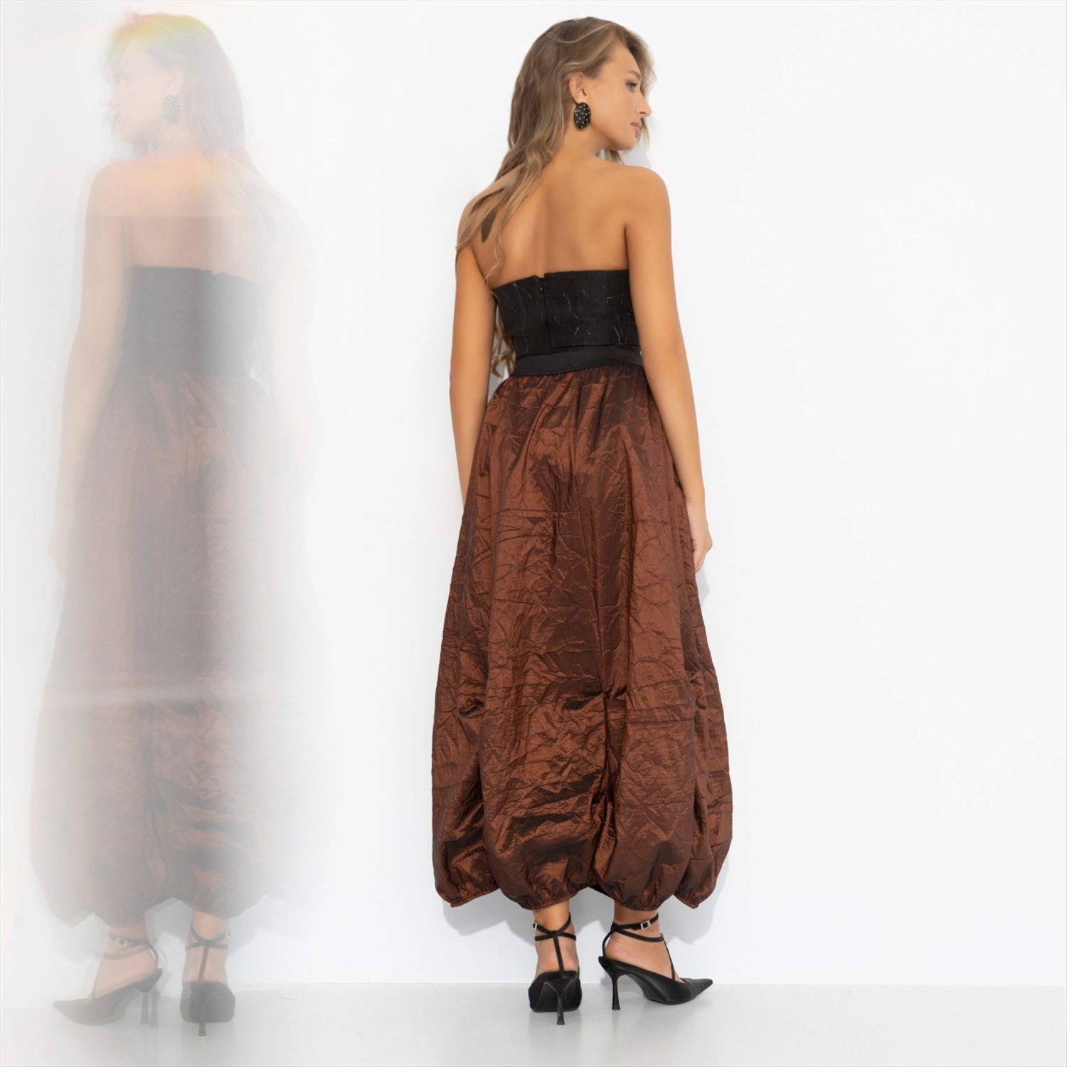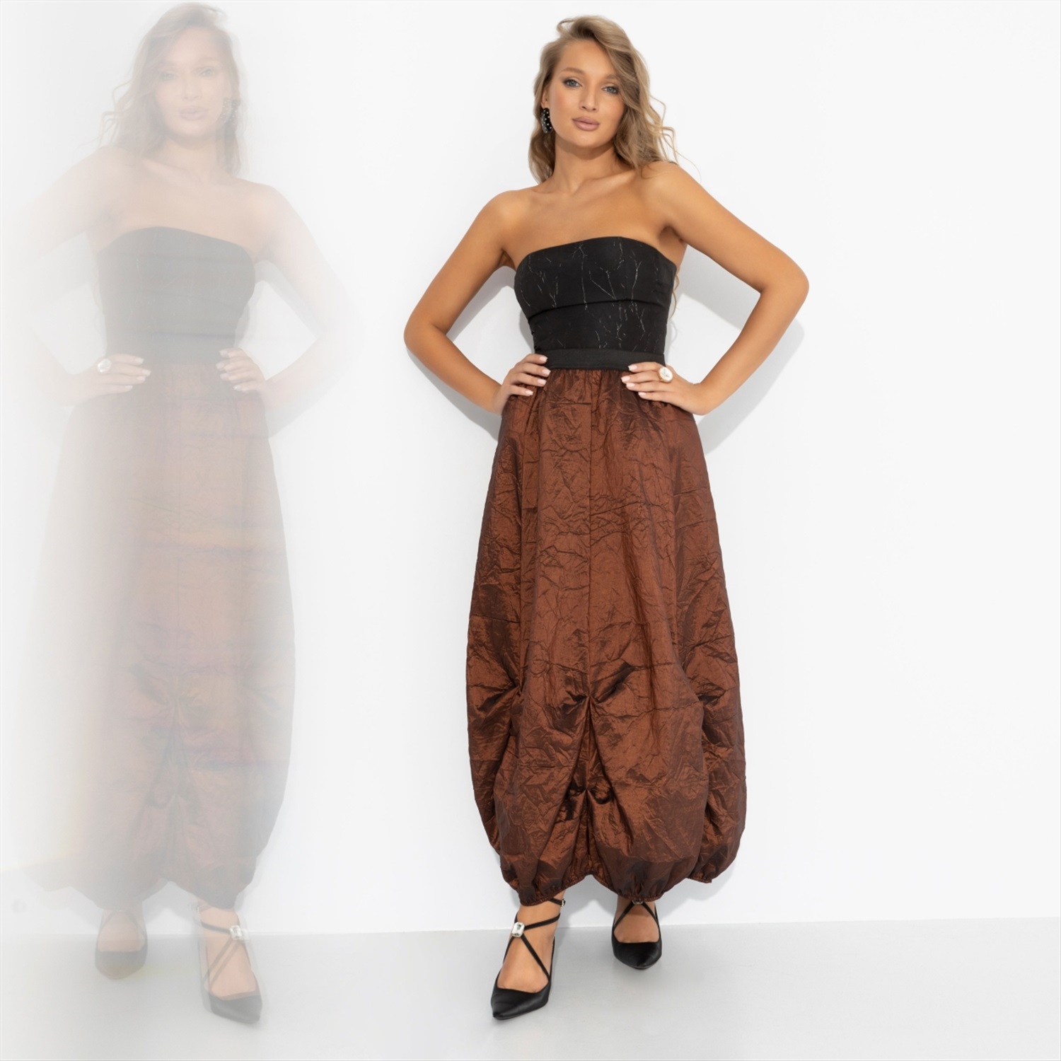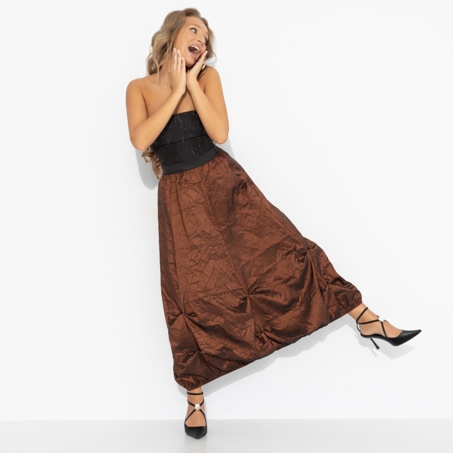 ТН ВЭД: 6204530000; Состав: Плательная ткань «таффета» (100% п/э); Плотность ткани: Средняя; Тип ткани: Текстиль; Вид застежки: Нет; Декоративные элементы: Драпировка; Основной цвет ткани: Коричневый; Отрезная талия: Есть; Подклад: Нет; Резинка по талии: Есть; Рисунок/раппорт: Нет, все изделия идентичны; Сезон: Круглогодичный; Стиль: Вечерний Параметры модели на фото: Грудь: 90 см Талия: 65 см Бёдра: 91 см Рост: 168 см. Размер на модели: 44 Длина изделия: * 42 размер - 95 см * 44 размер - 95 см * 46 размер - 95 см * 48 размер - 95 см * 50 размер - 95 см * 52 размер - 95 см Обхват талии: * 42 размер - 66 см * 44 размер - 70 см * 46 размер - 74 см * 48 размер - 78 см * 50 размер - 82 см * 52 размер - 86 см Обхват бёдер: * 42 размер - 112 см * 44 размер - 116 см * 46 размер - 120 см * 48 размер - 124 см * 50 размер - 128 см * 52 размер - 132 см Вес товара, кг: * 42 размер - 0.25 * 44 размер - 0.26 * 46 размер - 0.26 * 48 размер - 0.28 * 50 размер - 0.28 * 52 размер - 0.28 Габариты товара (ДхШхВ), см.: * 42 размер - 32 х 32 х 2 * 44 размер - 32 х 32 х 2 * 46 размер - 32 х 32 х 2 * 48 размер - 32 х 32 х 2 * 50 размер - 32 х 32 х 2 * 52 размер - 32 х 32 х 2 Юбка-баллон в оттенке эффектной бронзы, как на показах Celine. Хочешь удивить всех на корпоративной ёлке? Надевай с корсетом для wow-выхода по примеру Зендеи или с укороченным блейзером – в духе модных хроник Met Gala. Объемная юбка из жатой ткани с отливом и защипами. Пояс на резинке. Держит форму, не мнётся. Идеальна для трендовых сетов и акцентных образов любой вечеринки.