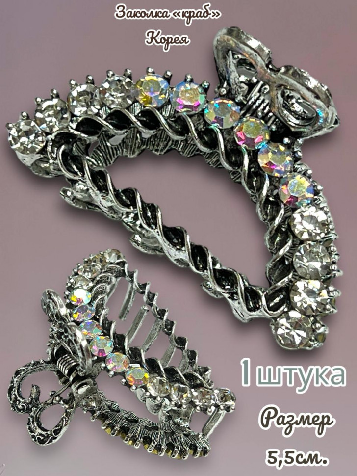 Стильная и красивая заколка среднего размера. Выполнена из качественного металла. Инкрустирована стразами. Подойдет как для густых так и для тонких волос и дополнит вашу прическу. Производитель Корея Размер 5,5*3,5 см.