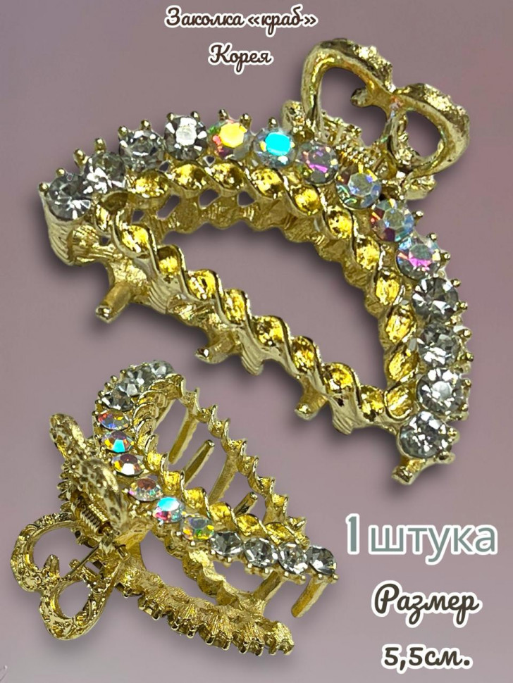 Стильная и красивая заколка среднего размера. Выполнена из качественного металла. Инкрустирована стразами. Подойдет как для густых так и для тонких волос и дополнит вашу прическу. Производитель Корея Размер 5,5*3,5 см.