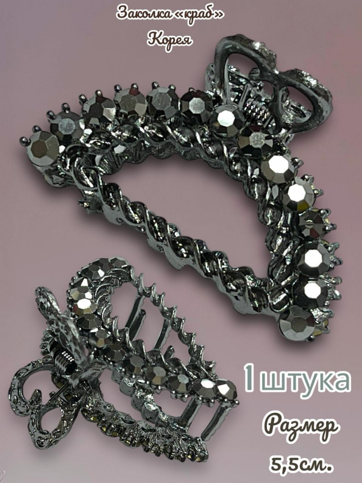 Стильная и красивая заколка среднего размера. Выполнена из качественного металла. Инкрустирована стразами. Подойдет как для густых так и для тонких волос и дополнит вашу прическу. Производитель Корея Размер 5,5*3,5 см.