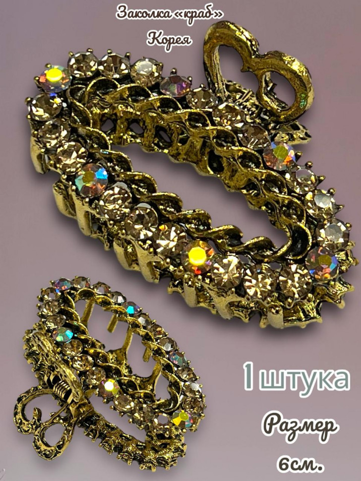 Стильная и красивая заколка среднего размера. Выполнена из качественного металла. Инкрустирована стразами. Подойдет как для густых так и для тонких волос и дополнит вашу прическу. Производитель Корея Размер 6*4 см.