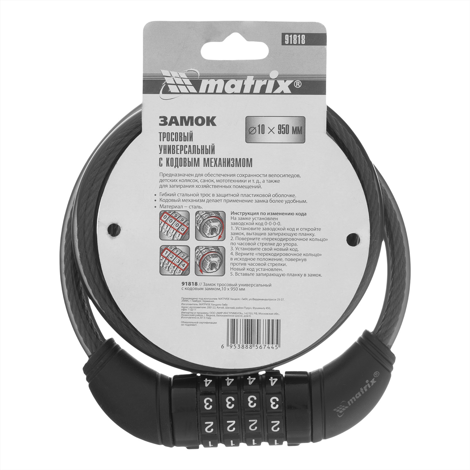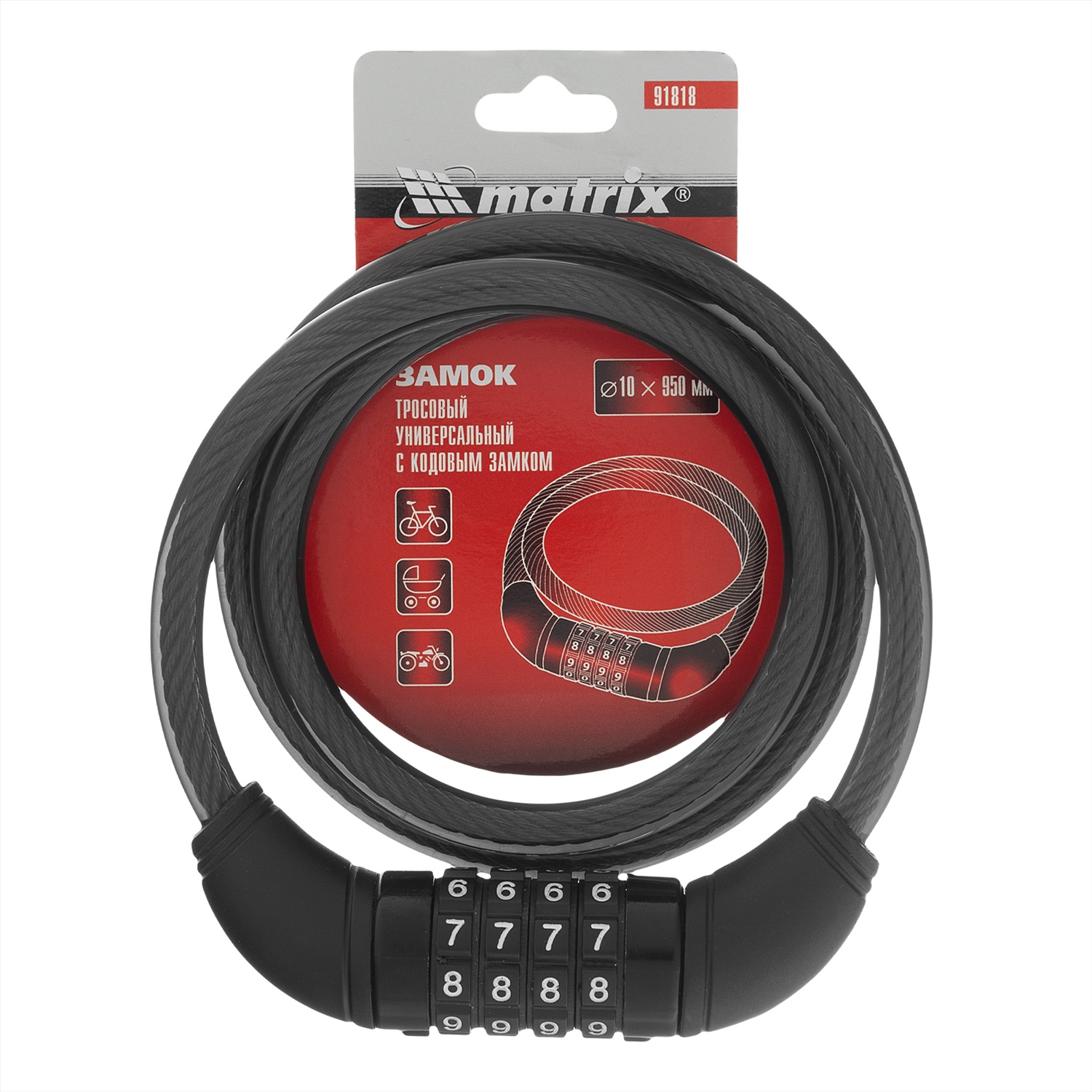 Универсальный тросовый замок Matrix 91818 размером 10 х 950 мм, с кодовым механизмом, обеспечивает безопасность имущества. Его можно брать с собой на прогулку и в дорогу, т.к. он компактен и не занимает много места в сумке. Замок позволяет пристегнуть велосипед, коляску, санки и другие транспортные средства к опоре. Трос длиной 950 мм можно обмотать вокруг колеса и рамы велосипеда для повышения надежности защиты.
