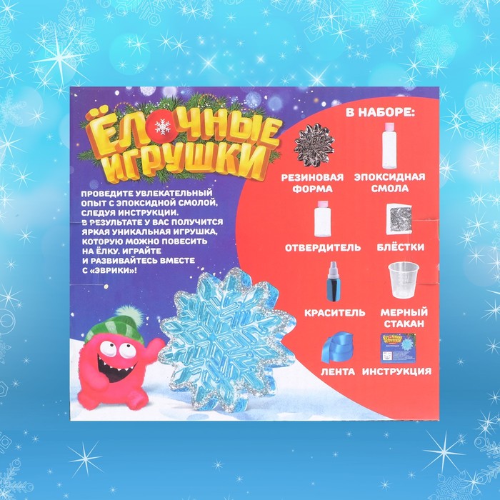 Габариты: 16,5 x 4,5 x 15 Страна: Китай В боксе: 66 набор Состав: Пластик, резина, эпоксидная смола Материалы: пластик, резина, эпоксидная смола Фасовка: по 1 набор Индивидуальная упаковка: Картонная коробка Сертификат: Не подлежит сертификации Для кого: Унисекс Возраст: От 3 лет Количество опытов: 1 Вес, г: 96 Символ года: Нет Тематика праздника: Новый год Вид науки: Химия Вид исследований: Опыты с эпоксидной смолой Вид итогового изделия: Ёлочное украшение Сделайте новогодние фигурки своими руками! Эпоксидная смола — это необычное вещество. Изначально оно жидкое, тягучее, но под воздействием отвердителя застывает и становится прочным. Особенность смолы в том, что она легко принимает любую форму и смешивается с любыми материалами. Пока она не застыла, в неё можно добавить краску, блёстки, камушки, листья — да что угодно, чтобы получить уникальные поделки! Именно поэтому её часто используют для изготовления украшений или ёлочных игрушек. С набором ТМ «Эврики» ребёнок создаст уникальное новогоднее украшение и узнает основы химии. Как играть?