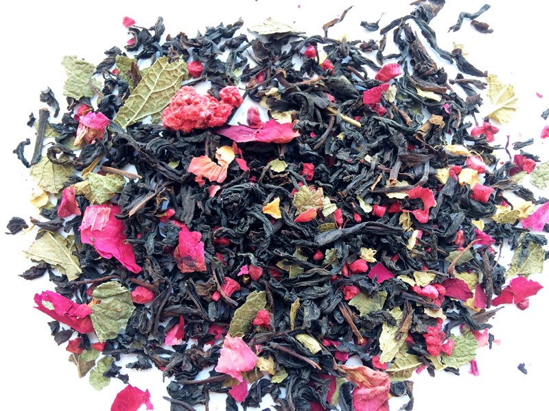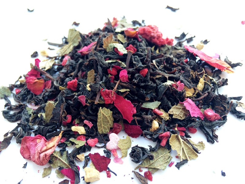 Бленд крупнолистового черного индийского чая, ягод малины, листьев земляники, кусочков имбиря, сахарных сердечек, лепестков розы. С согревающим малиновым ароматом.