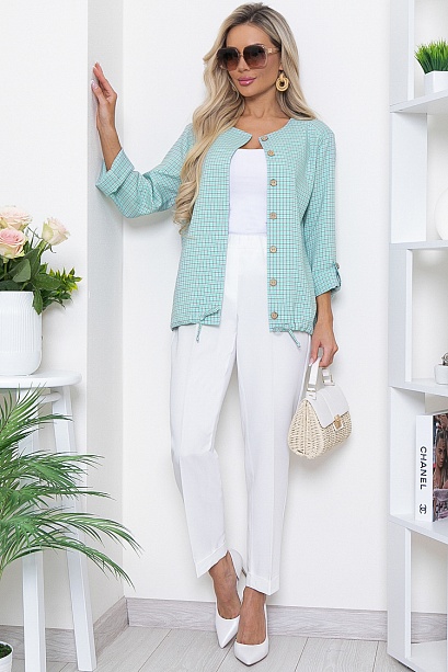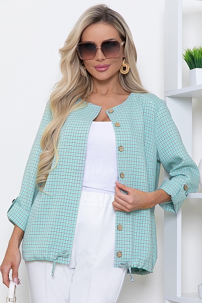 Жакет из комфортной костюмной ткани в мелкую клетку свободного силуэта с кулиской по низу.Центральная застежка на петли и пуговицы,в боковых швах функциональные карманы.Рукава втачные длинные с патой.