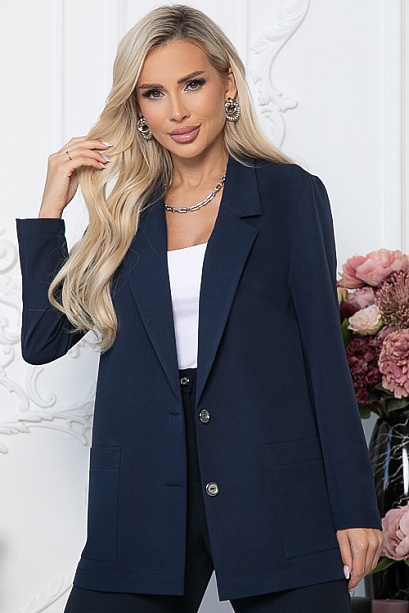 • Жакет из костюмной ткани свободного силуэта. Центральная застежка на две пуговицы. По переду удобные накладные карманы. Рукава втачные.
