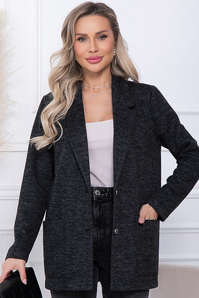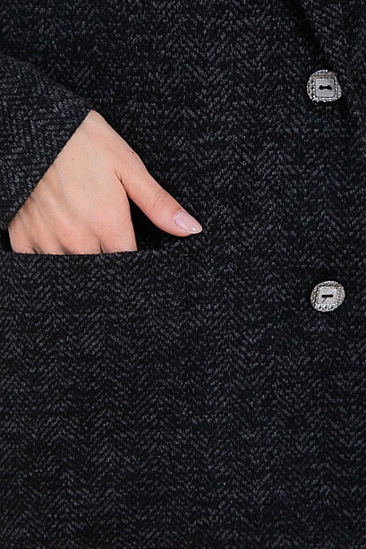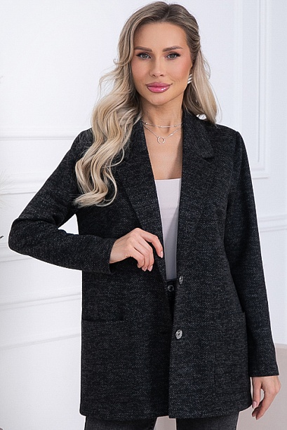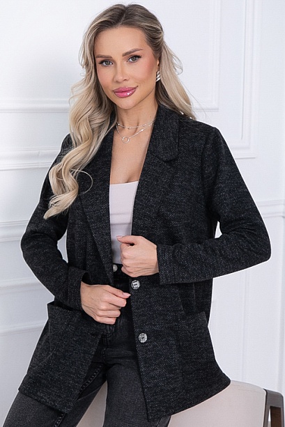 • Жакет свободного силуэта из теплого комфортного трикотажного полотна в елочку,прямого свободного силуэта .По переду центральная застежка на две пуговицы.Воротник отложной с лацканами.По переду жакета накладные удобные карманы.