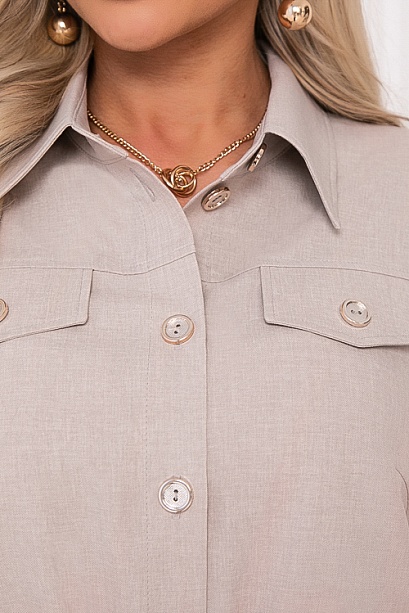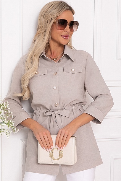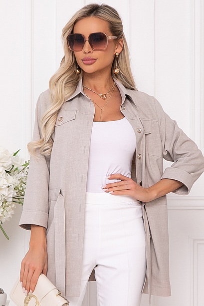 • Жакет из костюмной ткани(смесовая ткань со льном) свободного силуэта с центральной застежкой на пуговицы.Воротник отложной на стойке.По переду декоративные клапана.В боковых швах функциональные карманы.