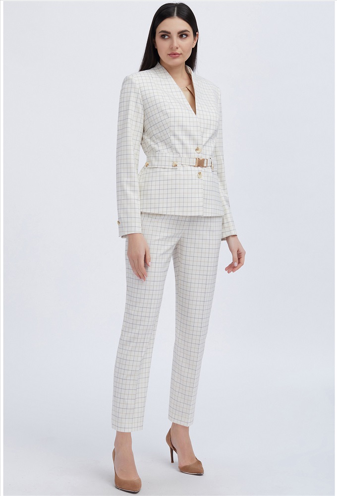 Укороченный однобортный жакет полуприлегающего силуэта будет одинаково уместен и в повседневном образе, и в офисе. Модель выполнена из мягкой ткани с добавлением вискозы с интересным сочетанием клетки. Перед с V-образным вырезом горловины, с застежкой на две петли и пуговицы и с двумя клапанами-шлевками с отделочными пуговицами, рукава втачные двухшовные с небольшими шлицами и также украшены отделочными пуговицами. Градус формальности модели снизил пояс из основной ткани с металлической пряжкой-карабин. На подкладке.
