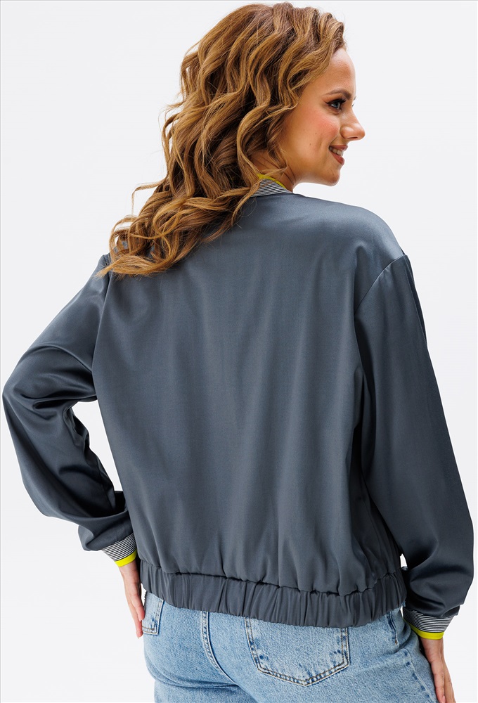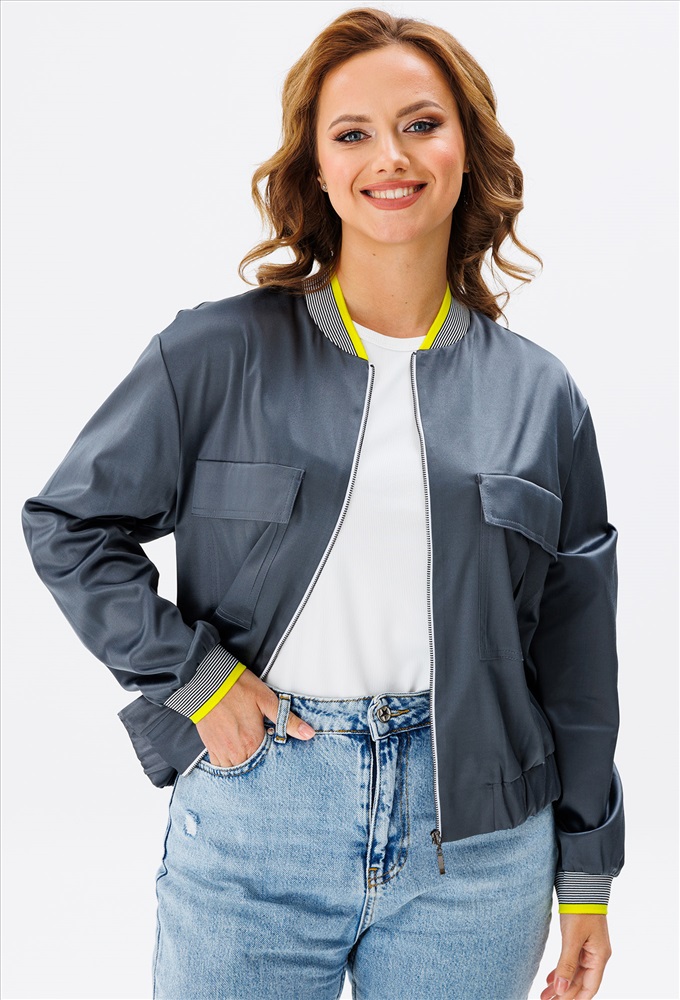 Бомбер прямого силуэта со слегка спущенным плечом, собран на резинку понизу. По переду настрочены карманы с встречной складкой и клапаном. Застежка на молнию по переду. Горловина обработана довязом. Рукав втачной одношовный собранный понизу на довяз.
