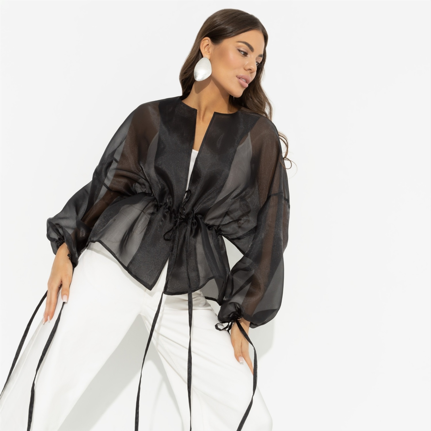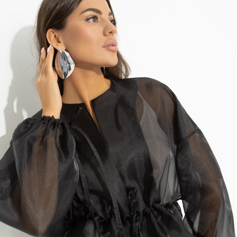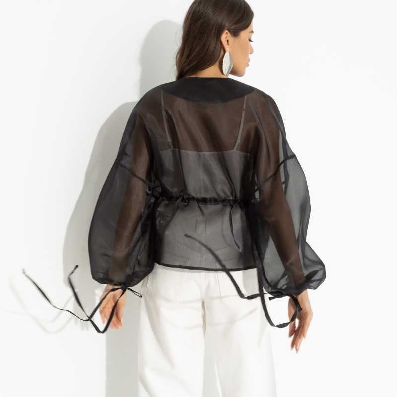 Пока все стоят в очереди за платьями, вы отходите в сторону… За жакетом CHARUTTI. Прозрачный, при этом элегантный, нарядный и роскошный, он выручит на любых праздничных мероприятиях, когда тебе захочется выделиться. Жакет свободный укороченный из полупрозрачной органзы. Пояс на тонких завязках. Спущена линия рукава. Рукав оформлен длинными завязками.