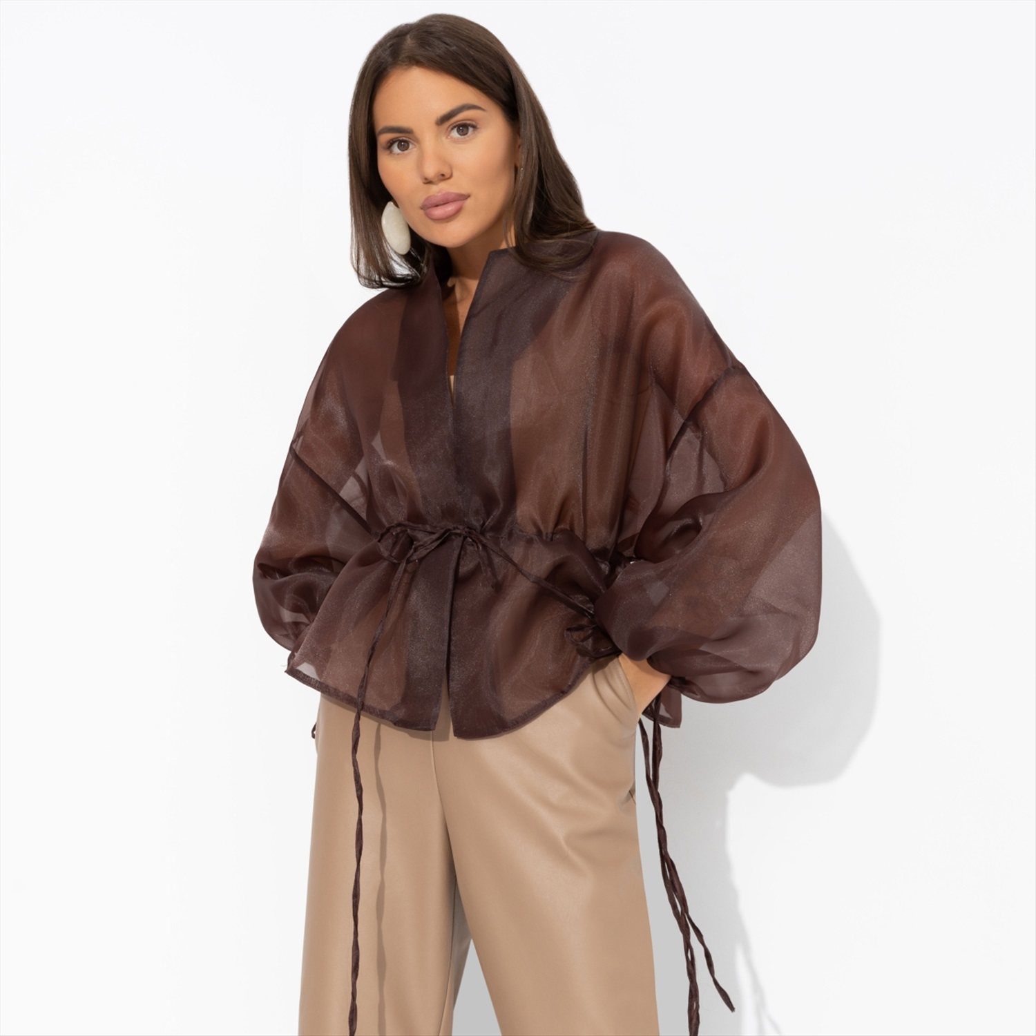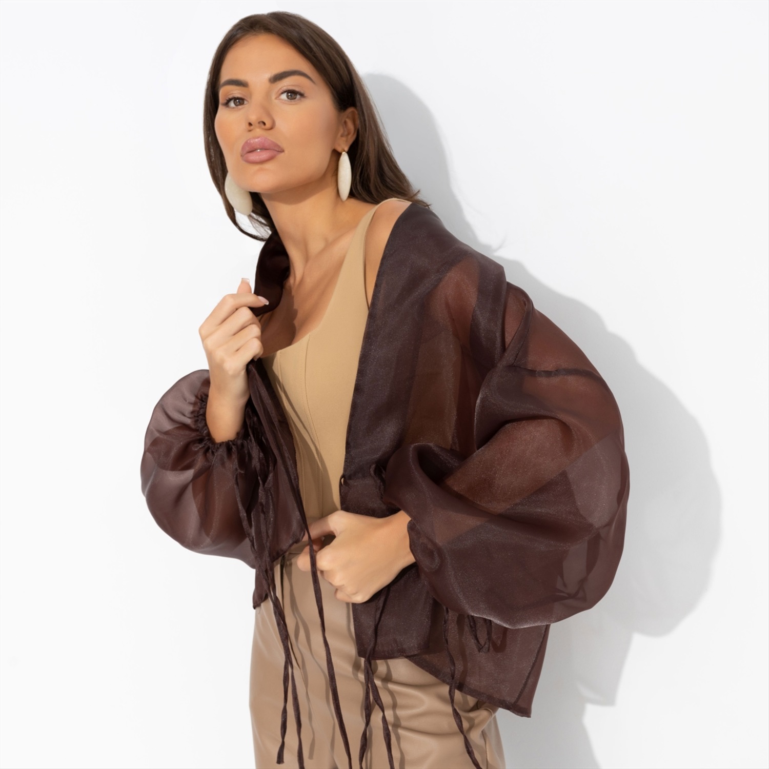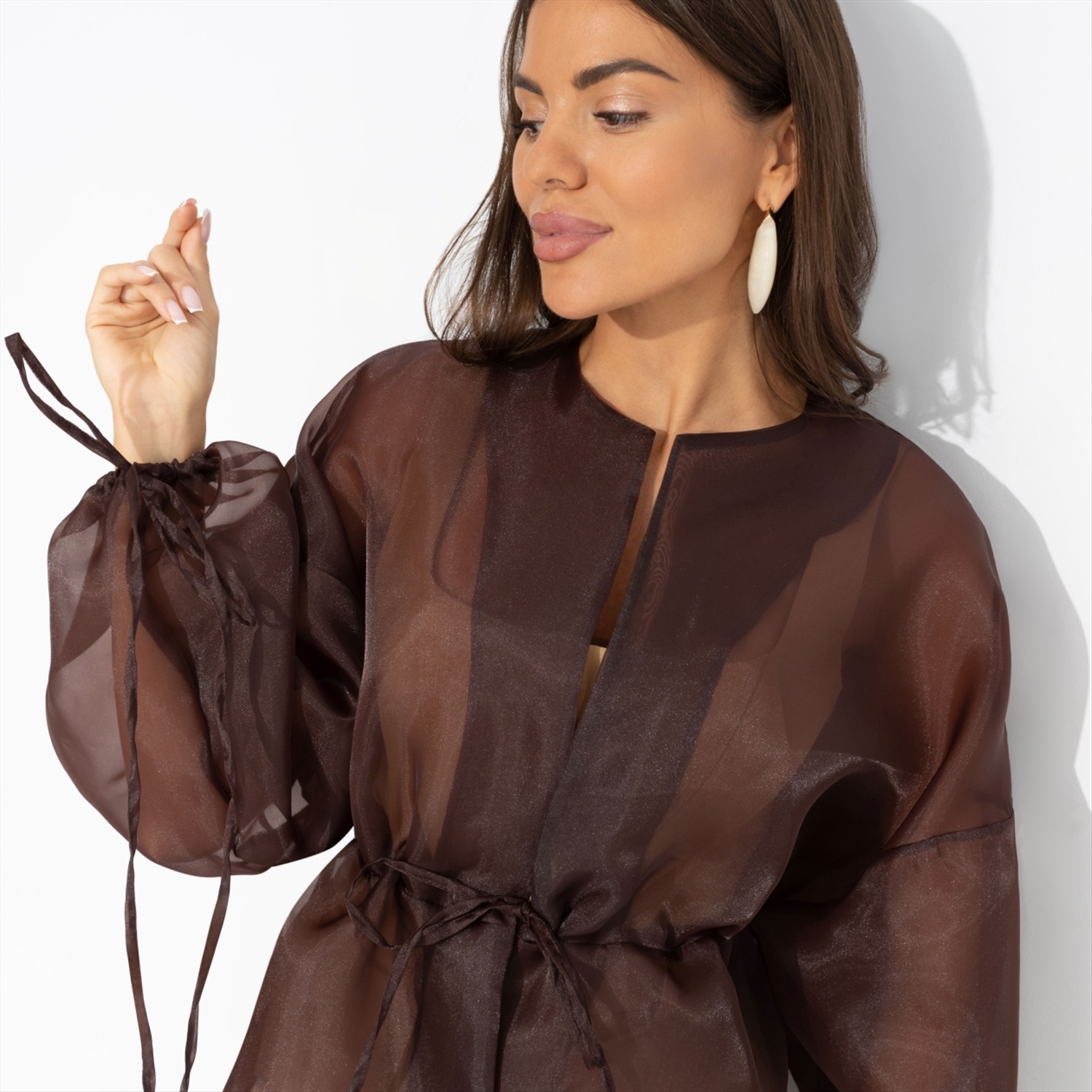 Жакет ЧАРУТТИ из струящейся органзы – её награда. Словно после длительной диеты она пробует долгожданный шоколадный фондан. Это несравненный вкус, воплощенный в ткани. Без компромиссов и угрызений совести. Он принадлежит тебе каждой клеточкой. Жакет на завязках. Линия плеча спущена. Посадка свободная. Изделие просвечивает.