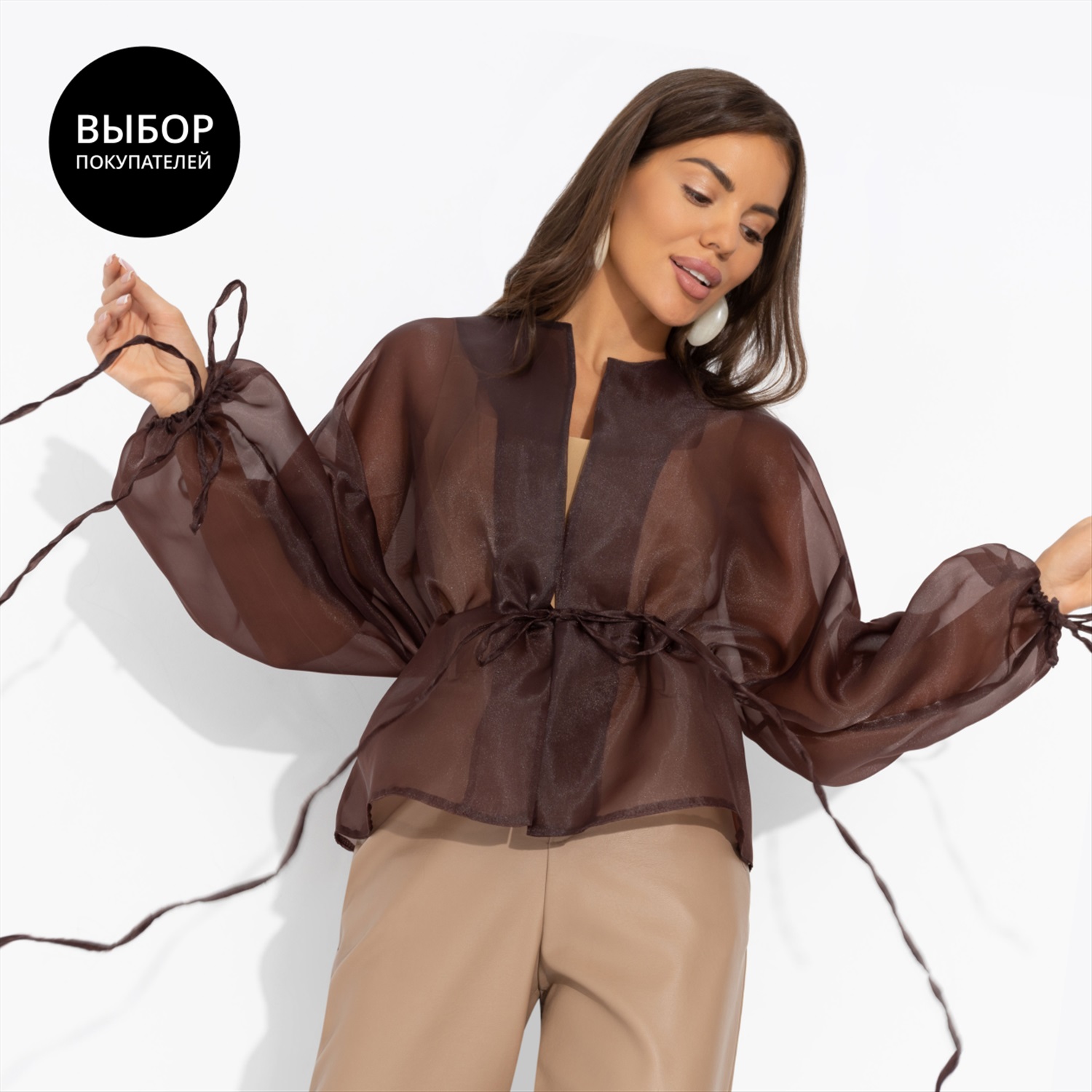 ТН ВЭД: 6104330000; Состав: «Органза» (100% полиэстер); Плотность ткани: Тонкая; Тип ткани: Текстиль; Вид застежки: Завязки; Карманы: Нет; Основной цвет ткани: Коричневый; Отрезная талия: Есть; Подклад: Нет; Резинка по талии: Есть; Рисунок/раппорт: Нет, все изделия идентичны; Сезон: Круглогодичный; Силуэт: Свободный; Стиль: Нарядный