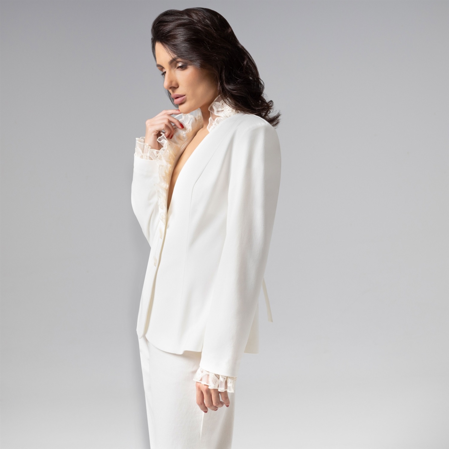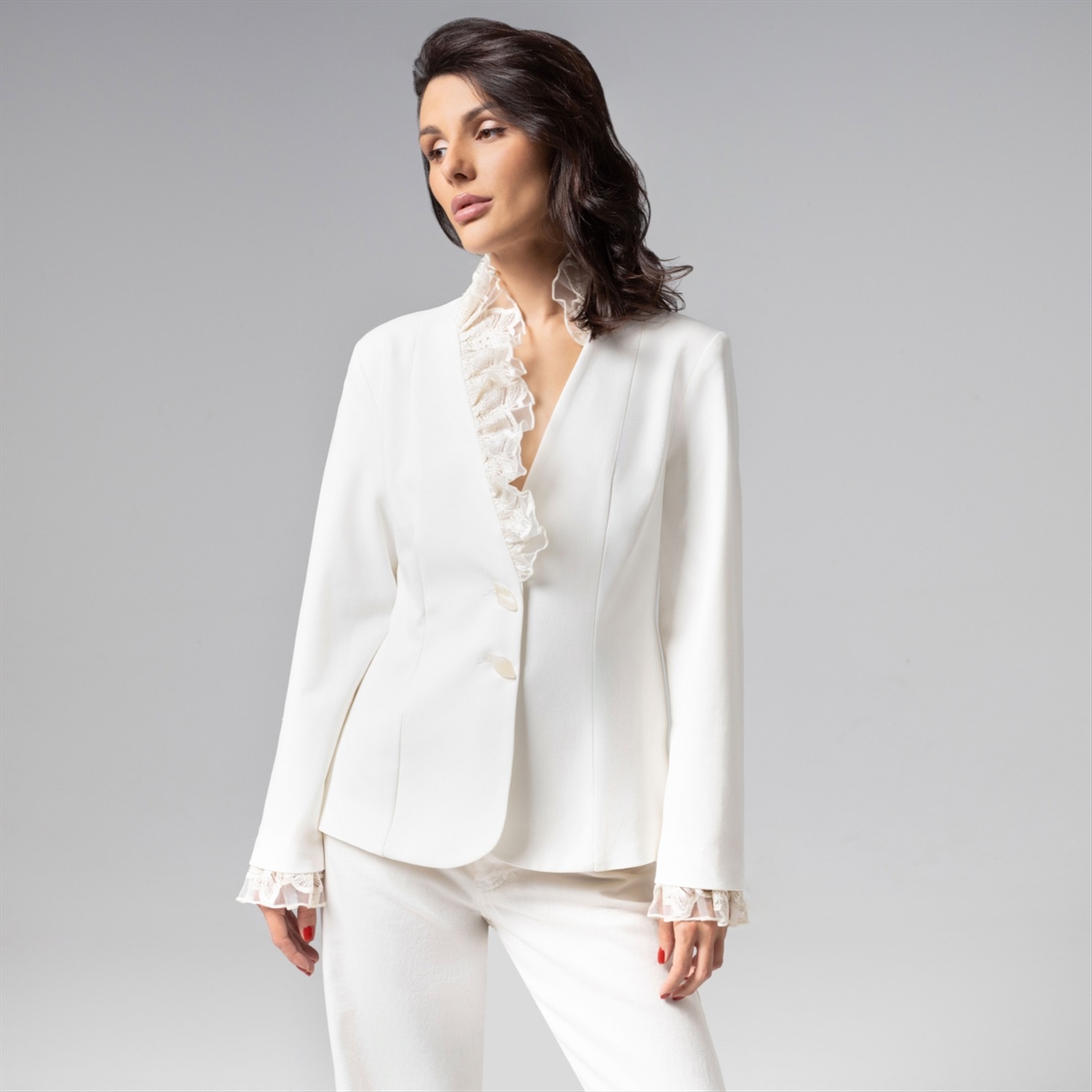 Слегка приталенный силуэт жакета от ЧАРУТТИ станет вашей визитной карточкой. Эффект безупречной элегантности без единого намека на высокомерие. Объемный кружевной декор, выполненный из материала высочайшего качества, обрамляет, словно драгоценная оправа и превращает обычный предмет гардероба в произведение портновского искусства. Чистота линий, лаконичность и классический молочный цвет делают этот жакет идеальным выбором для светских раутов или мероприятий судьбоносного масштаба. Филигранное воплощение роскоши от ЧАРУТТИ.