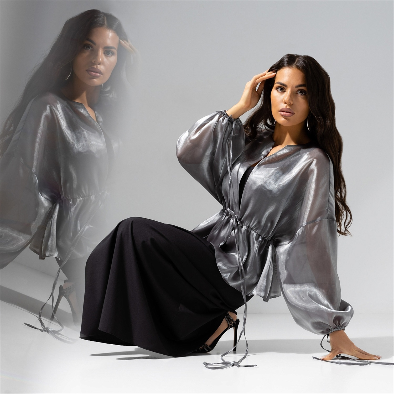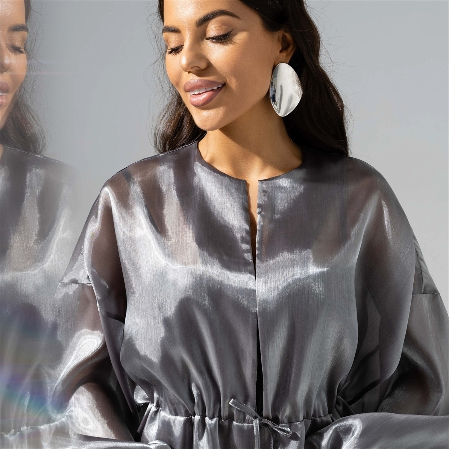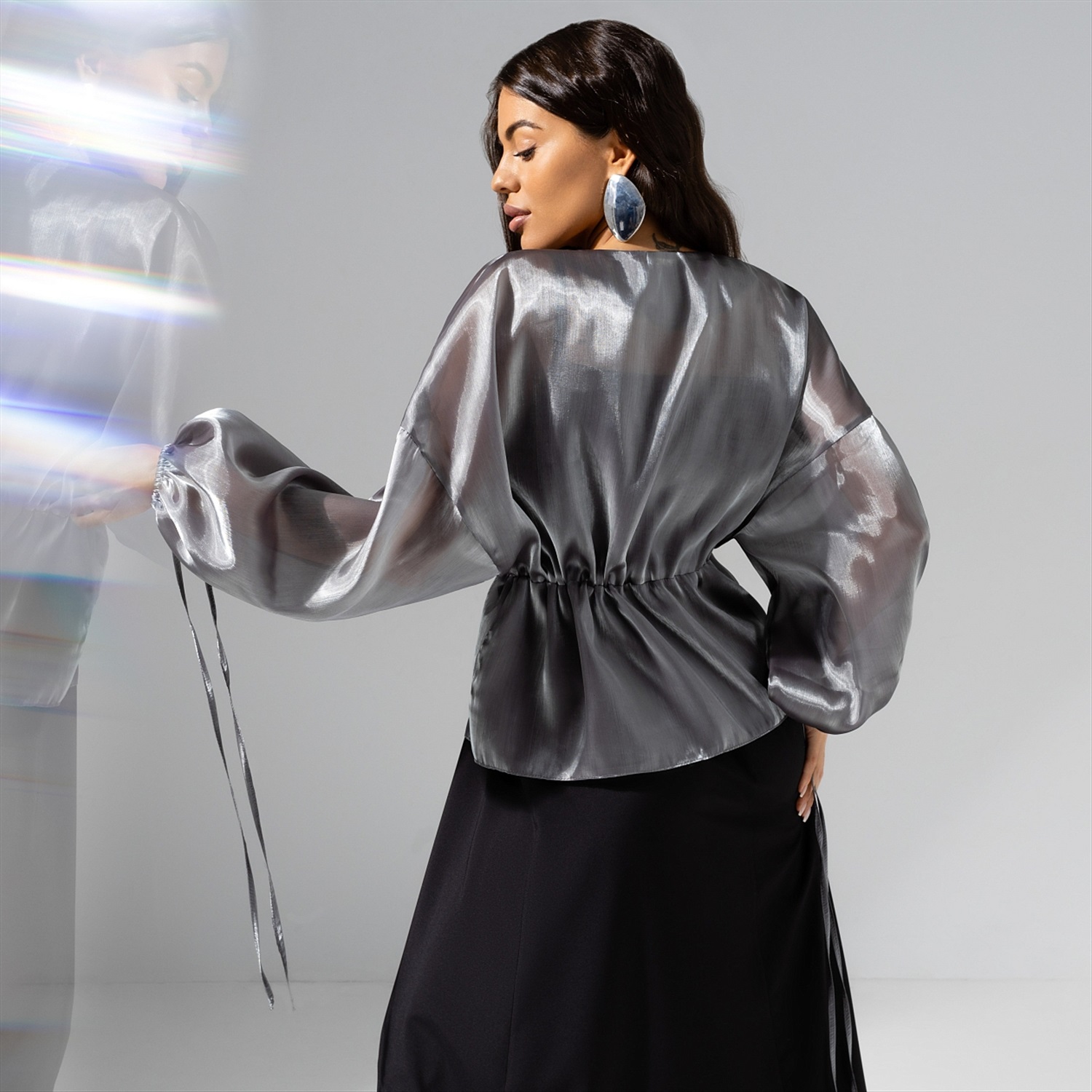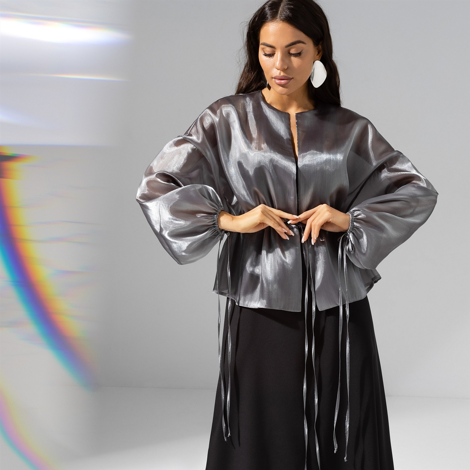 Если бы мир вдруг стал черно-белым, ты по-прежнему была бы в нем великолепна. Жакет CHARUTTI из органзы в цвете серебристый шик сделает тебя звездой в любых цветовых измерениях. Жакет из полупрозрачной органзы на завязках. Спущенная линия рукава. Рукава объемные, обрамлены длинными завязками по манжету в тон изделия.