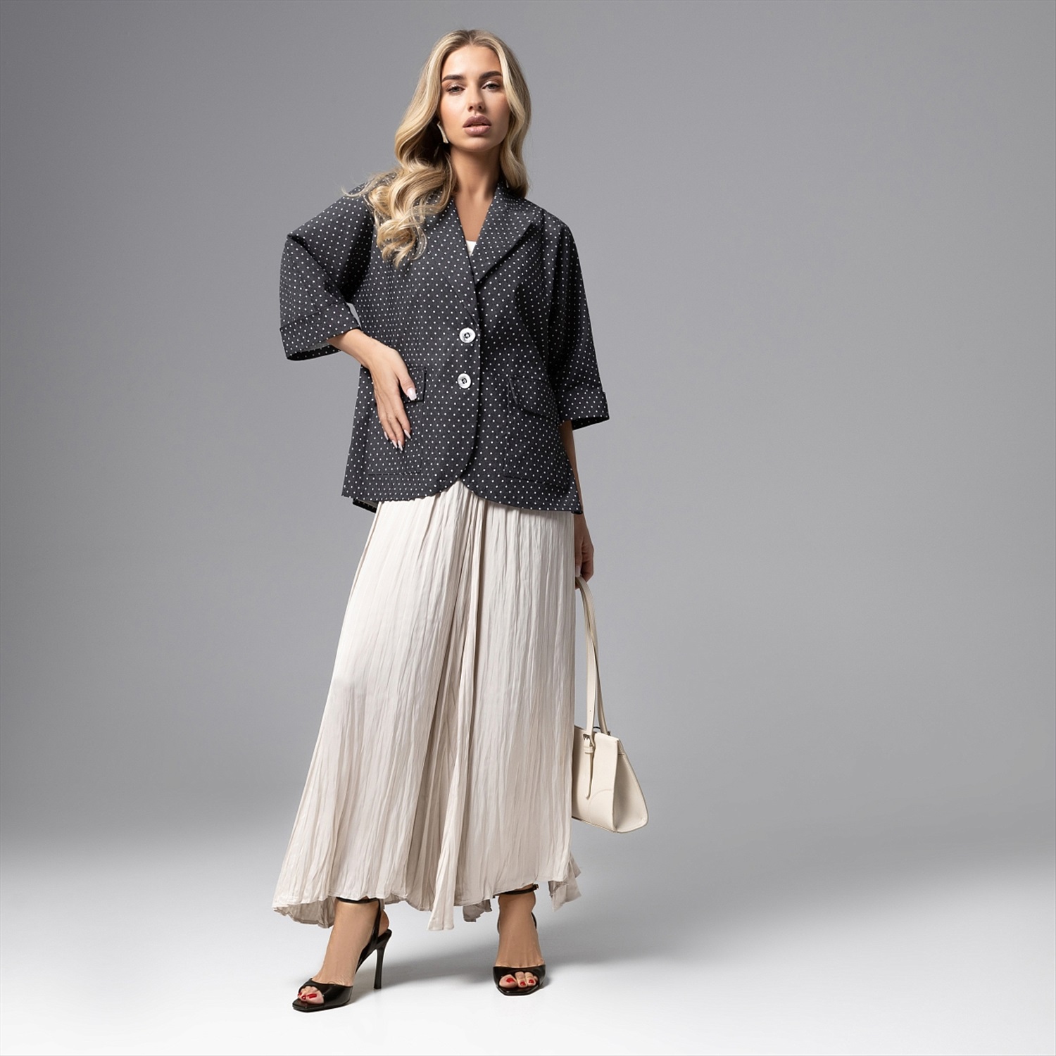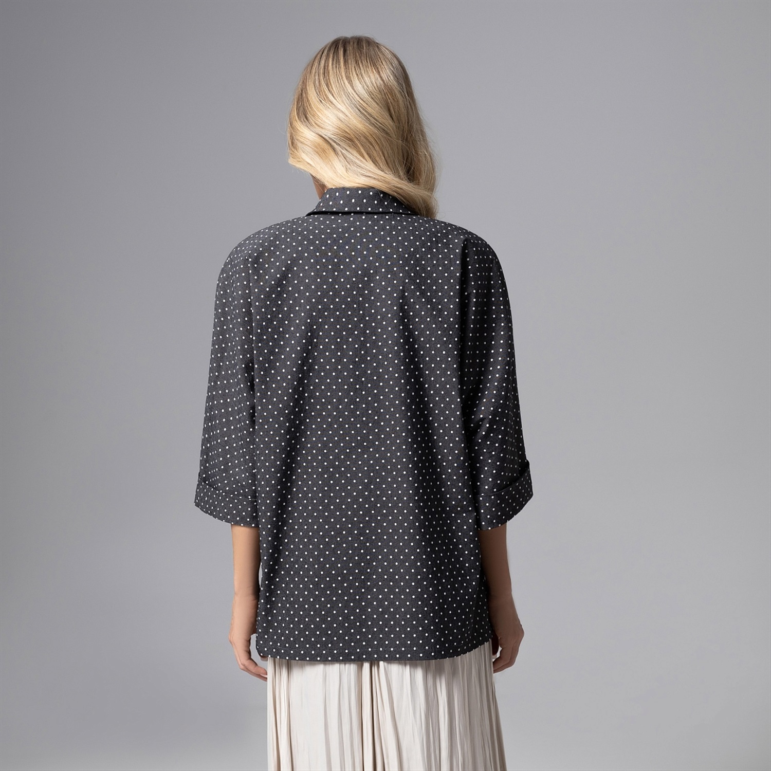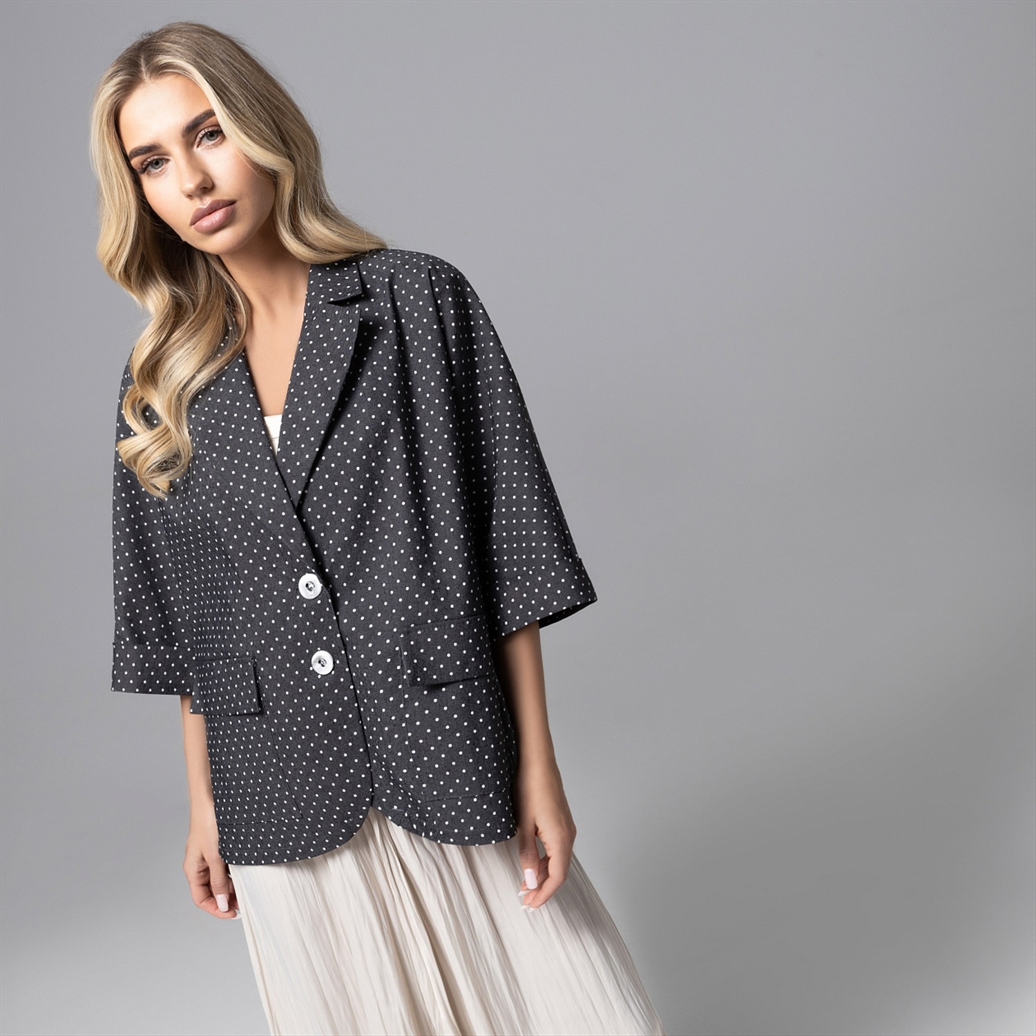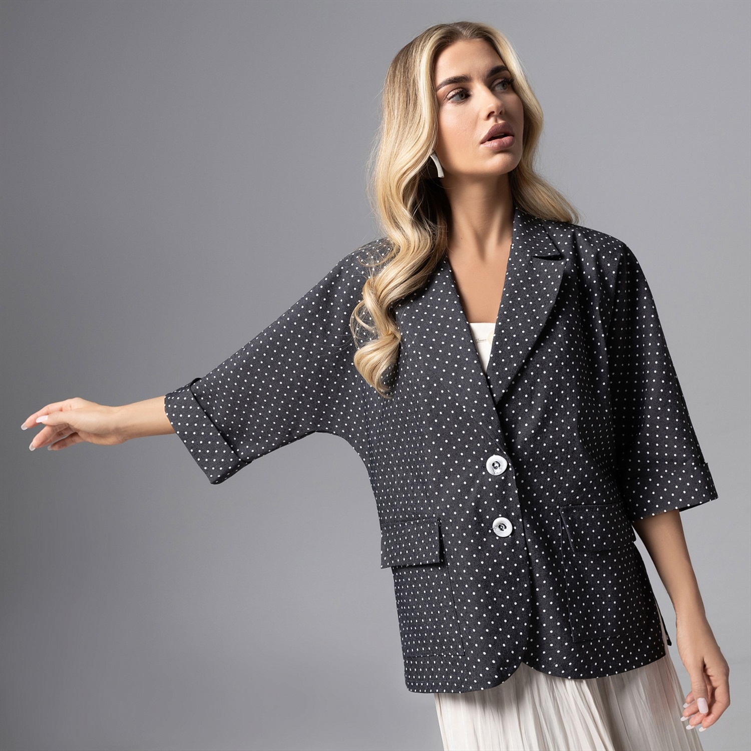 Превосходство в модной игре будет всегда за вами. Торжество элегантности в жакете в мелкий горох из коллекции PREMIUM. Жакет прямого кроя с лацканами. Жакет свободного кроя с лацканами, однобортный. Изделие с подплечниками и карманами, без подклада. Деликатные разрезы по бокам изделия. Хлопок хорошо держит форму. Можно стилизовать с юбками, брюками и джинсами.