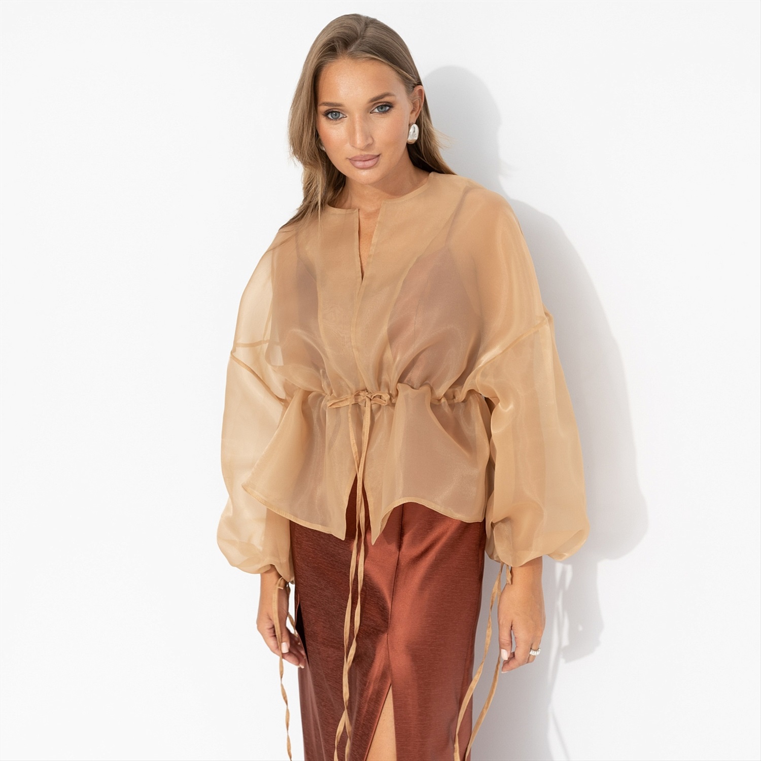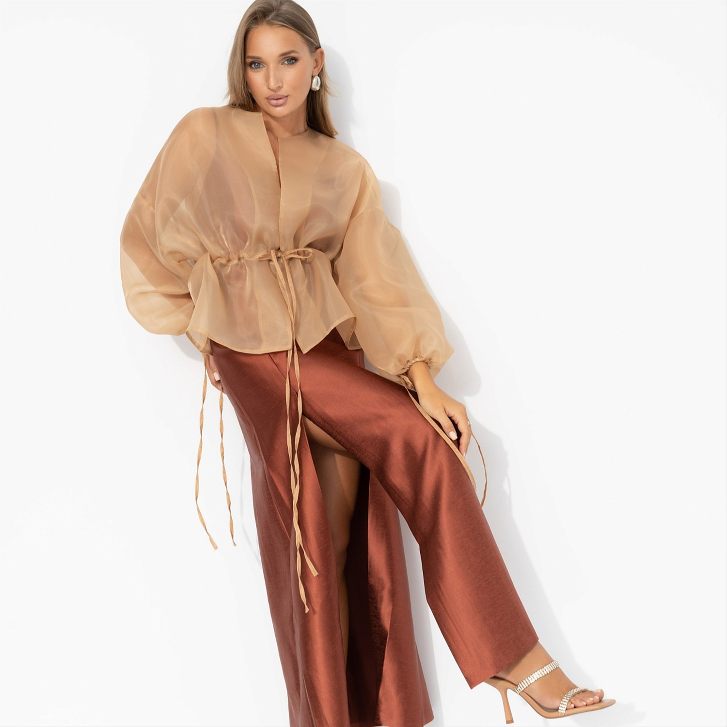 Она обожала превращать обычный поход за покупками в маленький выход в свет. Сегодня её главным союзником стал жакет ЧАРУТТИ цвета теплого песка. Его свободный крой словно окутывал её невесомой дымкой. Полупрозрачная ткань позволяла угадывать изящные линии топа, добавляя образу загадочности. Для неё наряжаться – это вид искусства, а жакет ЧАРУТТИ стал вдохновляющим шедевром. Жакет объемного кроя. Есть регулируемая кулиска на талии. Линия плеча спущена. Есть шнуровка по манжетам. Материал изделия слегка просвечивает.