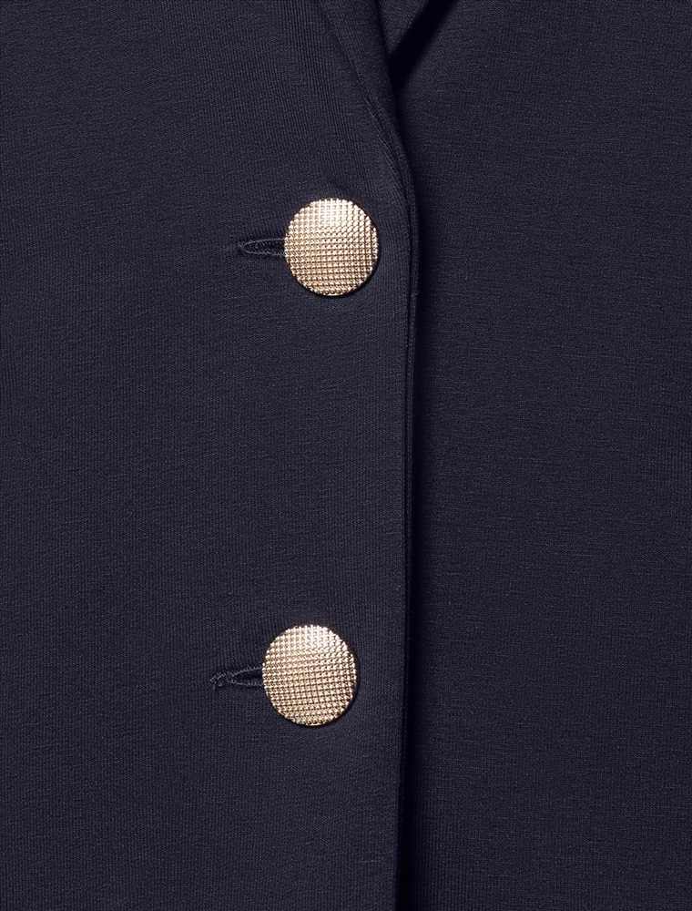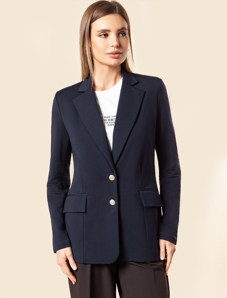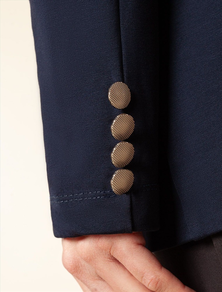 Жакет выполнен из тонкого футера с добавлением ПЭ, что способствует формоусточивости и стойкости цвета. Жакет на контрастной подкладке из 100% хлопка. Ярким акцентом этой модели являются 2 металлические пуговицы золотистых оттенков. Имеются боковые накладные карманы. Совет стилиста: Идеальная модель для не строгого офисного дресс-кода.