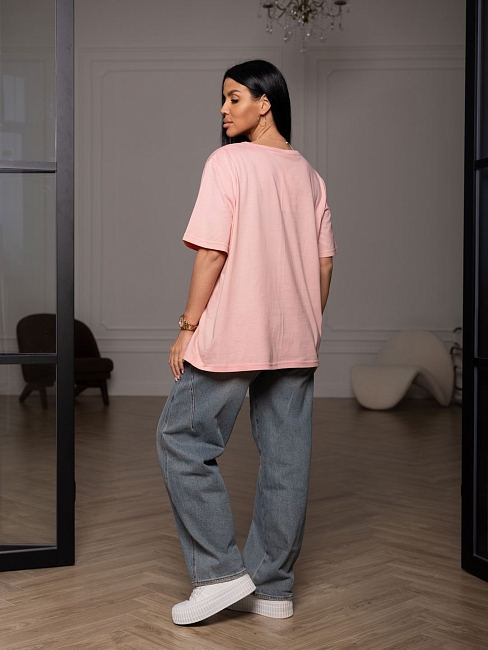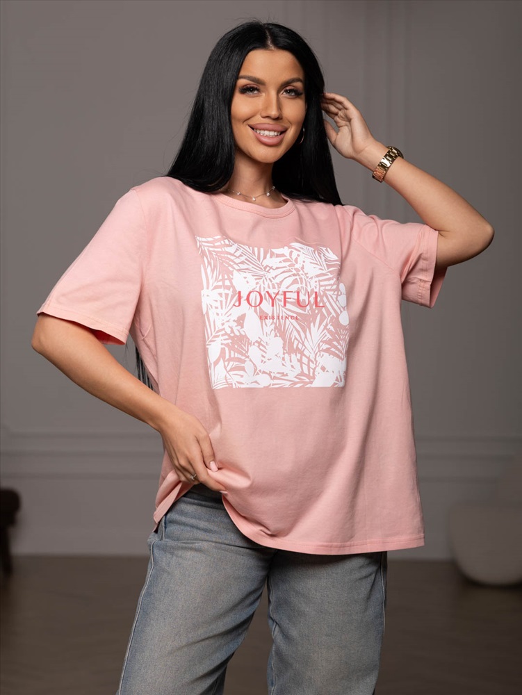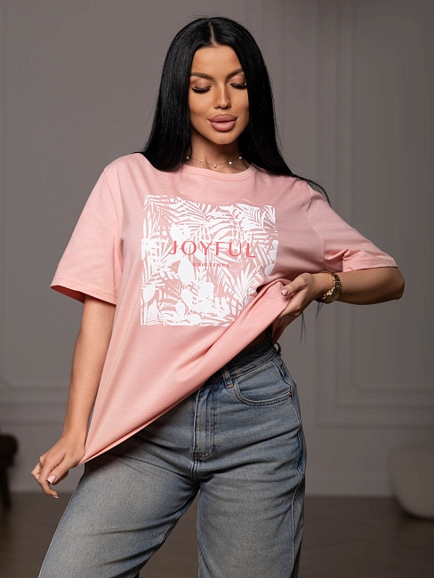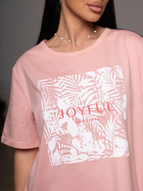 Футболка женская, прямого силуэта с принтом, О-образной горловиной. Рукав короткий, свободный. Футболка выполнена из трикотажного полотна 100% хлопка.