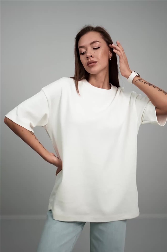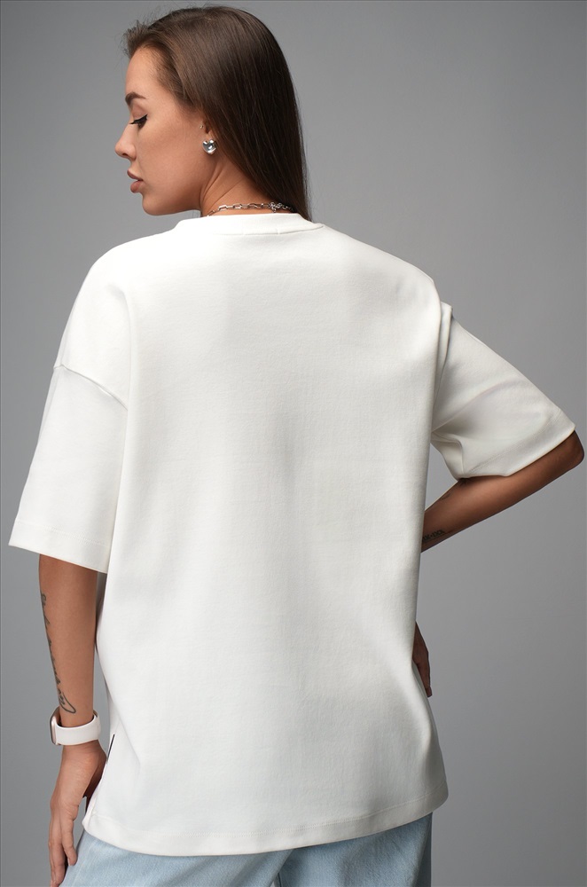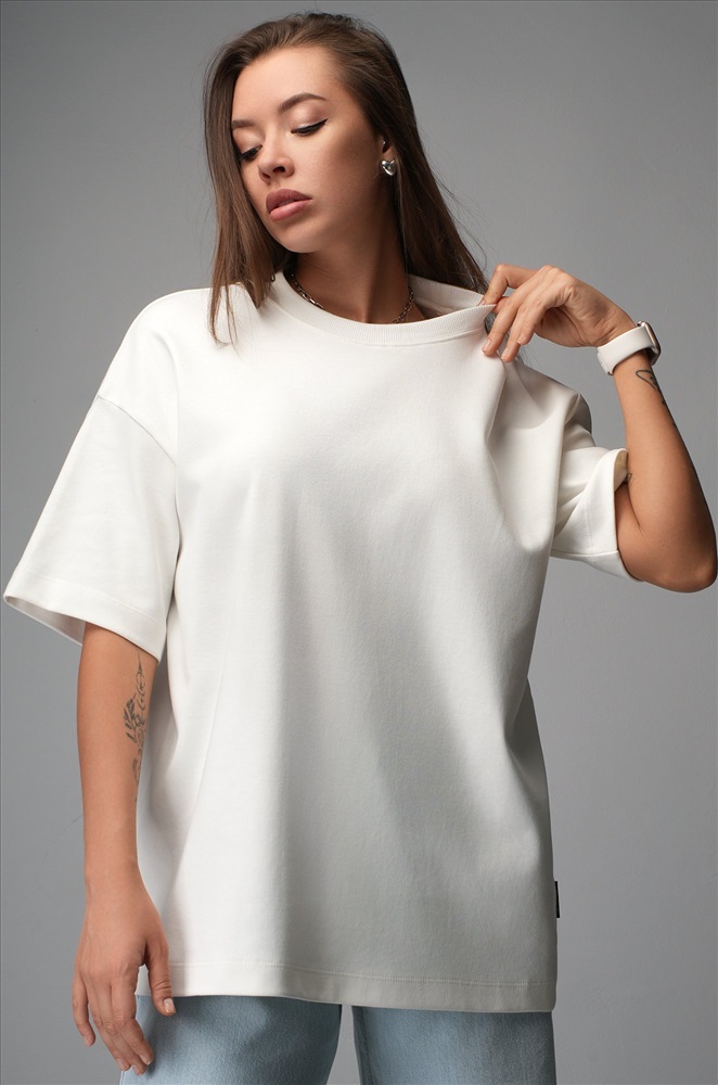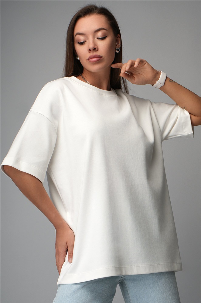 Базовая футболка оверсайз создана для тех, кто любит сочетание свободы движений и актуального дизайна. Удлиненный рукав до локтя придает образу расслабленную элегантность, а светлый молочный цвет делает эту стильную находку универсальной.