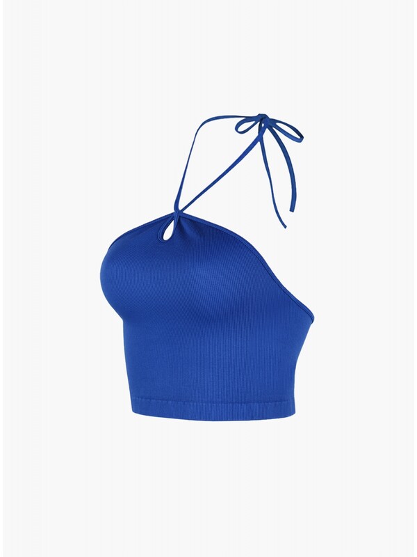 Топ из полиамида, синего цвета, в рубчик, на завязках, без рукавов, укороченный.