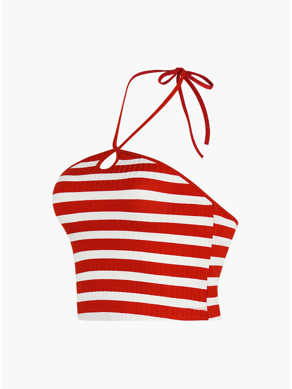 Топ выполнен из вискозы в тонкий рубчик, красно-белого цвета в полоску, без рукавов с регулируемыми завязками, укороченный.
