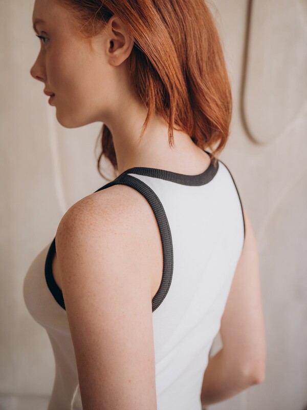 Классический белоснежный топ из натурального хлопка с черной окантовкой по краю.