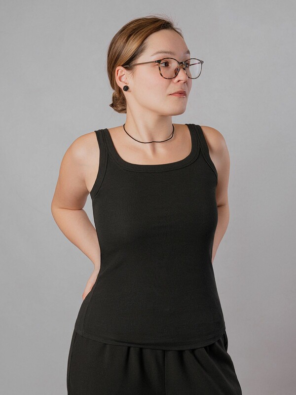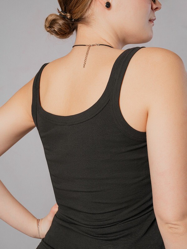 Майка женская изготовлена из хлопкового трикотажа и выполнена в классическом черном цвете.