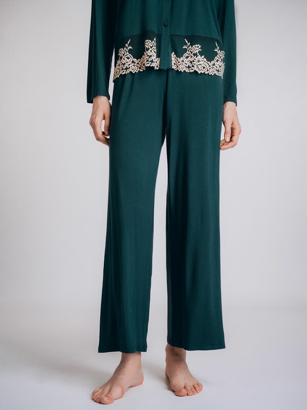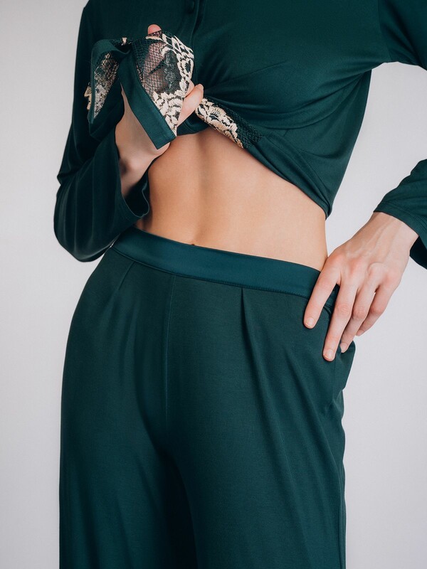 Рубашка: - С длинными рукавами. - Украшена кружевной вставкой по нижнему краю. - Застегивается на тканевые пуговицы Брюки: - Свободного кроя, что делает их удобными для повседневной носки. - Пояс выполнен из мягкой резинки, обеспечивающей комфортную посадку. - Комплект идеально подойдет для домашнего отдыха, сна или даже для приема гостей 95% Вискоза 5% Эластан Комментарии к товару
