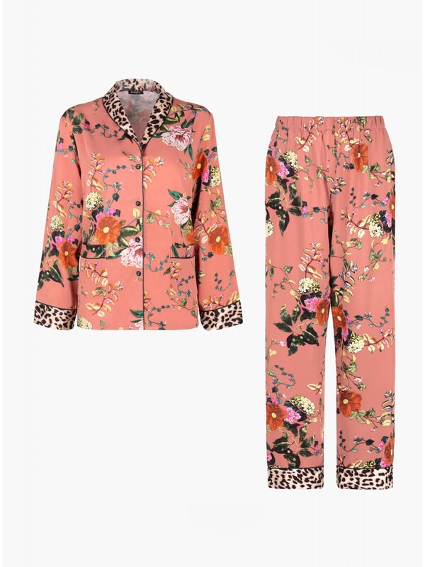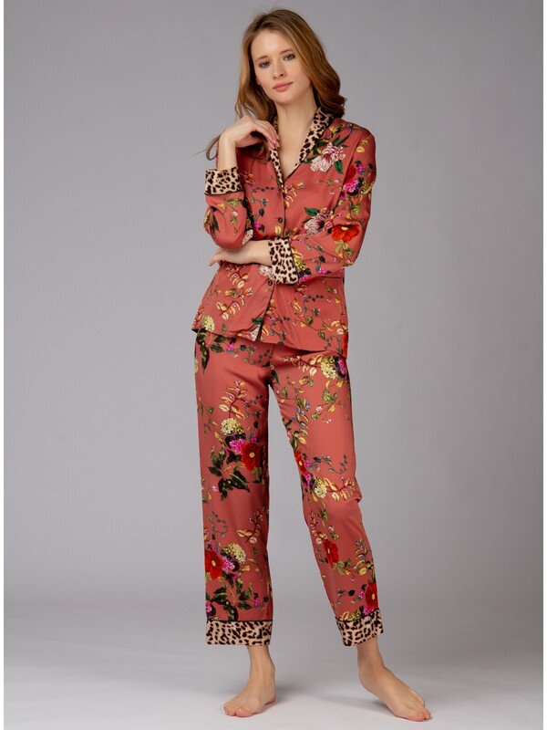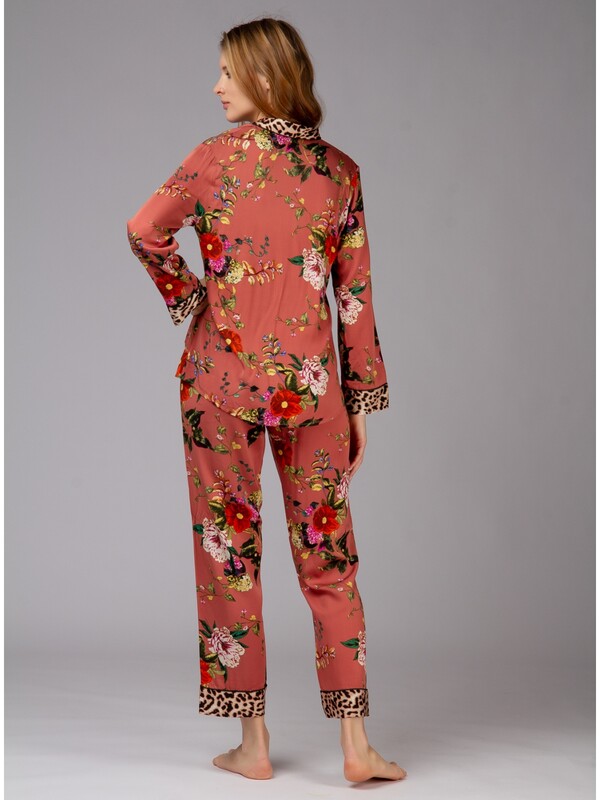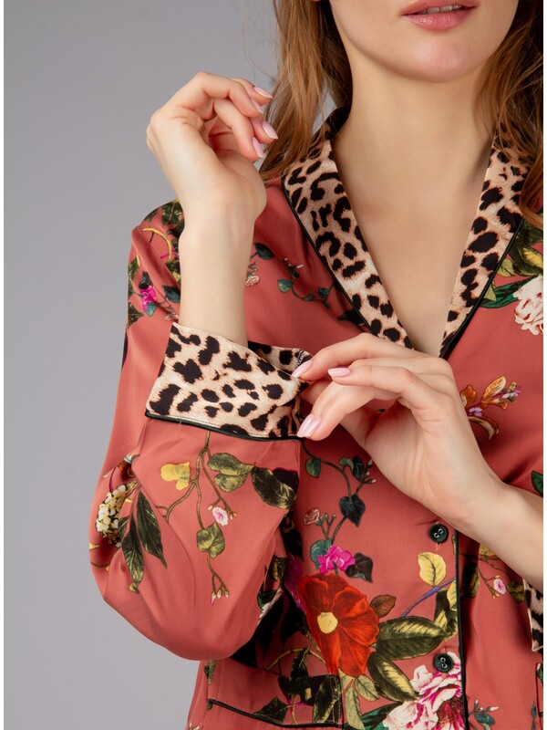 Домашняя пижама от торговой марки Индефини. В комплекте рубашка с брюками. Рубашка из вискозы, красно-коричневого цвета, с цветочным принтом, со вставками леопардового принта, с длинными рукавами, с воротником-отворотом, с кармашками по бокам, на пуговичках, прямая, свободного кроя. Брюки из вискозы, красно-коричневого цвета, с цветочным принтом, со вставками леопардового принта, на мягкой резинке, прямые, свободного кроя.