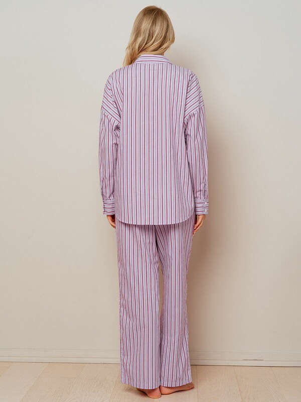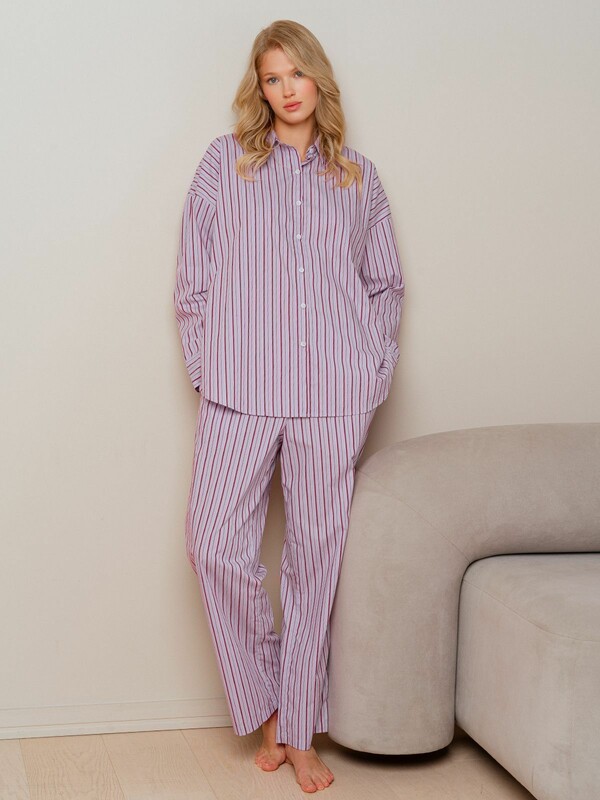 Рубашка свободного кроя с отложным воротником, длинными рукавами и застегивающимися пуговицами спереди и на манжетах. Брюки прямого свободного кроя с боковыми карманами и на мягкой эластичной резинке на талии обеспечивают удобство и свободу движений во время носки, надежно фиксируясь на теле. Пижама украшена принтом в полоску. 100% Хлопок Комментарии к товару