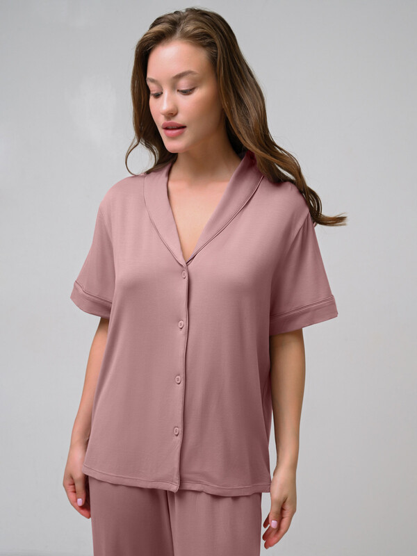 Пижама женская 4265TBC бренда Indefini из модала приятная и мягкая на ощупь. Футболка свободного кроя позволяет свободно передвигаться и чувствовать комфорт. Она имеет короткие рукава, отложной воротник и застёгивающиеся пуговицы.