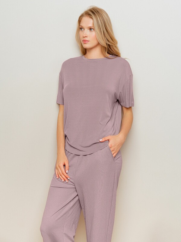 Футболка изготовлена из сочетания модала и акрила, она имеет свободный прямой крой и короткий рукава Брюки изготовлены из сочетания вискозы и нейлона, имеют прямой свободный крой и карманы по бокам 65% Акрил 27% Модал 8% Эластан/ 55% Вискоза 45% Полиамид Комментарии к товару