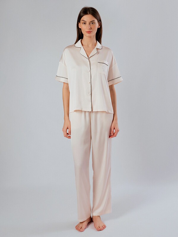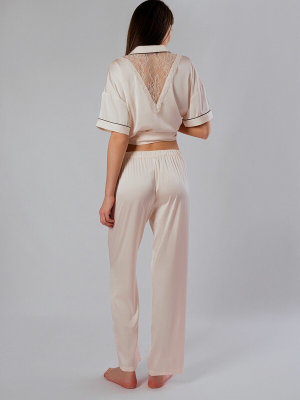 Состоит из рубашки и брюк. Рубашка с короткими рукавами и отложным воротником украшена V-образной кружевной вставкой сзади. Нагрудный карман рубашки украшен стразами. Брюки прямого кроя имеют мягкую резинку на талии и боковые карманы. 95% Полиэстер 5% Эластан Комментарии к товару