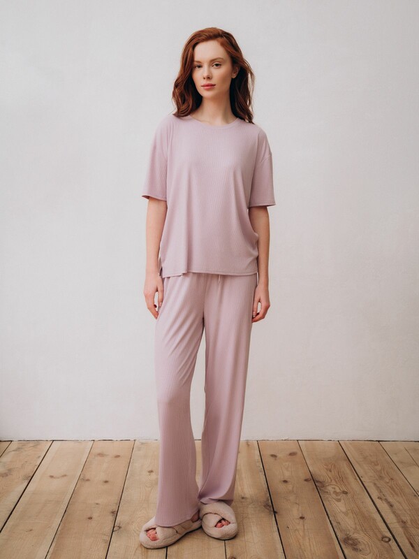 Выполнена в сиреневом цвете с фактурой ткани в рубчик. Пижама включает в себя футболку и брюки. Футболка прямого свободного кроя имеет короткие рукава и округлый вырез. Брюки прямого свободного кроя имеют широкую мягкую резинку на талии с регулирующим шнурком внутри. 65% Вискоза 30% Полиэстер 5% Эластан Комментарии к товару