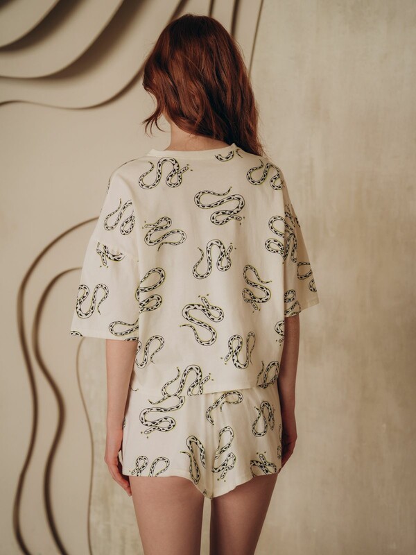 Пижама состоит из футболки и шорт. Футболка имеет короткие рукава, прямой крой и округлый вырез. Шорты крепко держатся на талии благодаря эластичной резинке. Пижама украшена анималистичным принтом с изображением змей, на футболку спереди нанесена надпись «Medusa». 100% Хлопок Комментарии к товару