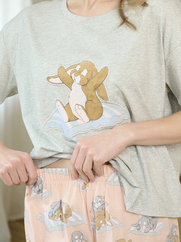 Состоит из футболки и шорт. Выполнена в двухцветной комбинации: футболка — светло-серая меланж, шорты — нежно-розовые. Футболка свободного кроя с круглым вырезом горловины и короткими рукавами. На груди расположен принт с изображением милого кролика на подушке. Шорты на мягкой эластичной резинке с повторяющимся принтом кроликов на подушках по всему изделию. 100% Хлопок Комментарии к товару