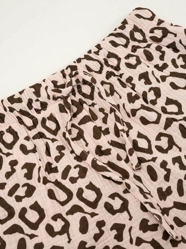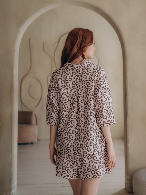 В комплекте рубашка с шортами. Рубашка на пуговицах имеет рукава три четверти и отложной воротник. Рубашка дополнена нагрудным карманом. Шорты имеют боковые карманы и широкую мягкую резинку на талии с регулирующим шнурком. Пижама выполнена в бежевом цвете с нанесенным на неё анималистичным принтом. 100% Хлопок Комментарии к товару