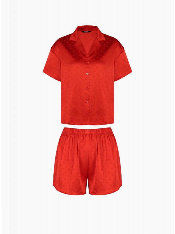 Верхняя часть в виде футболки с отложным воротником и пуговицами в тон ткани. Одна пуговица в форме сердечка украшена драгоценными камнями. Шорты на мягкой эластичной резинке с боковыми вырезами. 100% Полиэстер Комментарии к товару
