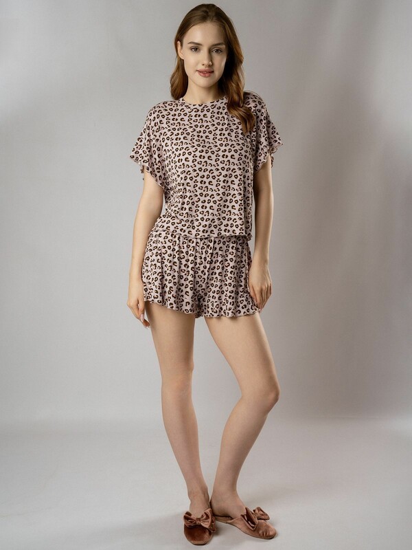 Пижама из нежной вискозы с фактурой в рубчик окутывает вас, как облако — настолько легкой и приятной кажется ткань. Футболка с выразительными плечами подчеркивает силуэт, а шорты идеально сидят на талии, даря полную свободу движений. Приглушенный леопардовый принт добавляет изюминку, не перегружая образ.