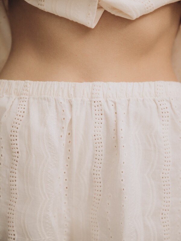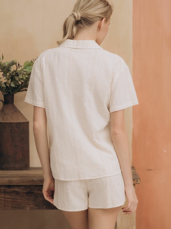 Выполнена в молочном цвете. Ткань пижамы выполнена с ажурной вышивкой. В комплект входят рубашка с шортами. Рубашка прямого кроя имеет короткие рукава и отложной воротник. Застёгивается спереди на пуговицы в цвет ткани. Шорты держатся на талии мягкой эластичной резинкой. 100% Хлопок Комментарии к товару