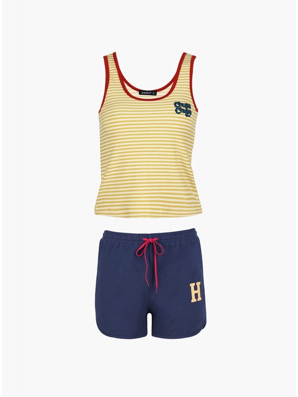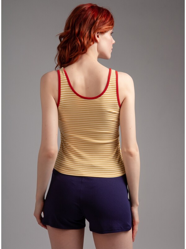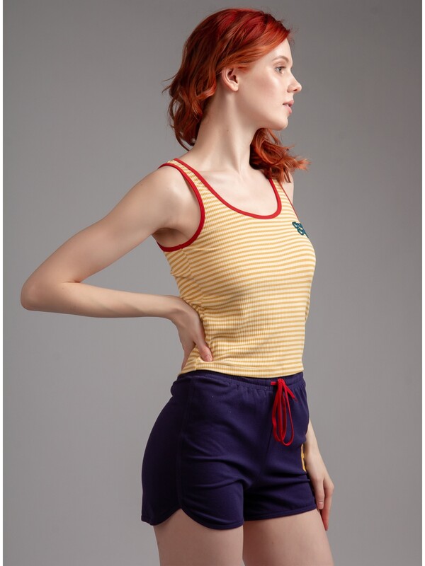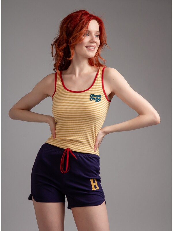 В комплекте майка-топ и шорты. Майка из вискозы, желтого цвета, с принтом, в полоску, без рукавов, прилегающая. Шорты из хлопка, синего цвета, с принтом-нашивкой, прямые, прилегающие. 90% Вискоза 10% Эластан/ 95% Хлопок 5% Эластан Комментарии к товару