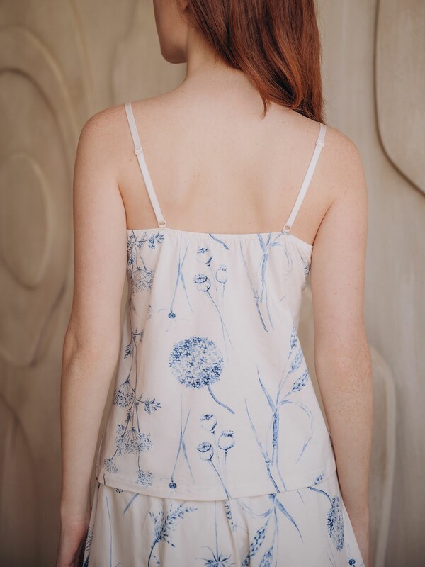 В комплекте майка с шортами. Майка на тонких регулируемых бретелях имеет резинку на задней части верхнего выреза. На передней части майки имеется горизонтальная кружевная вставка, передняя часть верхнего выреза обрамлена кружевом. Шорты на тонкой мягкой резинке, их нижние вырезы обрамлены кружевом. Пижама выполнена в белом цвете с нанесенным синим цветочным принтом. 47,5% Бамбук 47,5% Хлопок 5% Эластан Комментарии к товару
