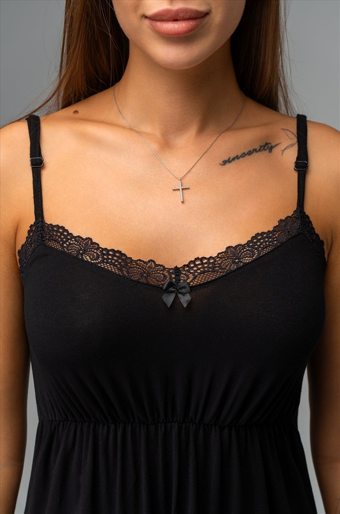 Однотонная черная сорочка – квинтэссенция обольстительного шарма и нежности. Свободный крой делает сорочку уютной, а кружево на декольте и тонкие бретели добавляют нотку кокетства.