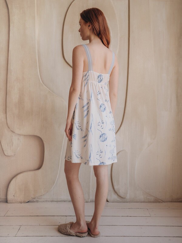 Выполнена в белом цвете с нанесенным синим цветочным принтом. Широкие нерегулируемые бретели выполнены с кружевом. В зоне декольте имеются две декоративные пуговицы. В области груди расположена тонкая эластичная резинка. 47,5% Бамбук 47,5% Хлопок 5% Эластан Комментарии к товару